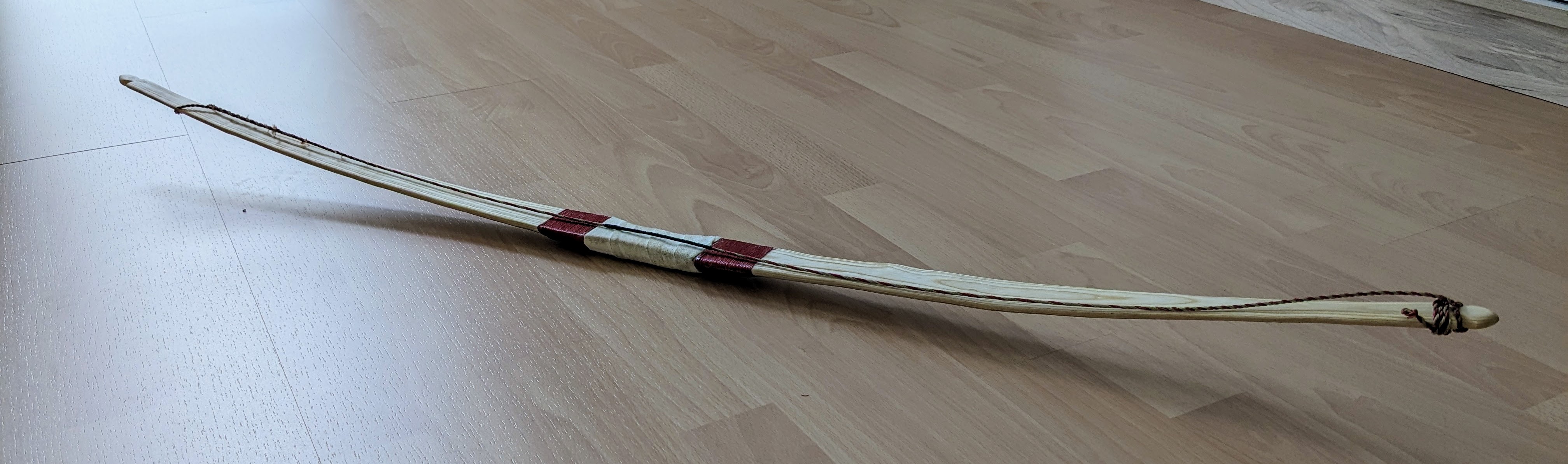 Netter Shorty, biegt halt immer noch zu stark in der Mitte. Aber 42# für das Federgewicht ist schon ordentlich. Man sieht mal wieder, dass bei Esche auch mit sehr dünnen Jahresringen Bogen gebaut werden können.
