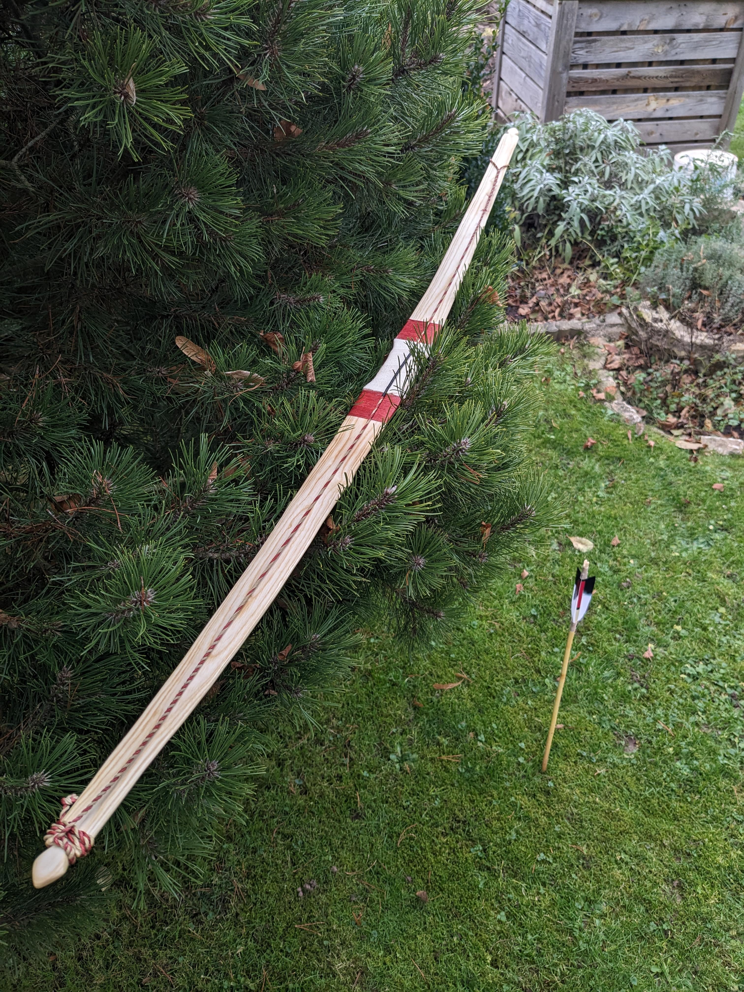 Netter Shorty, biegt halt immer noch zu stark in der Mitte. Aber 42# für das Federgewicht ist schon ordentlich. Man sieht mal wieder, dass bei Esche auch mit sehr dünnen Jahresringen Bogen gebaut werden können.
