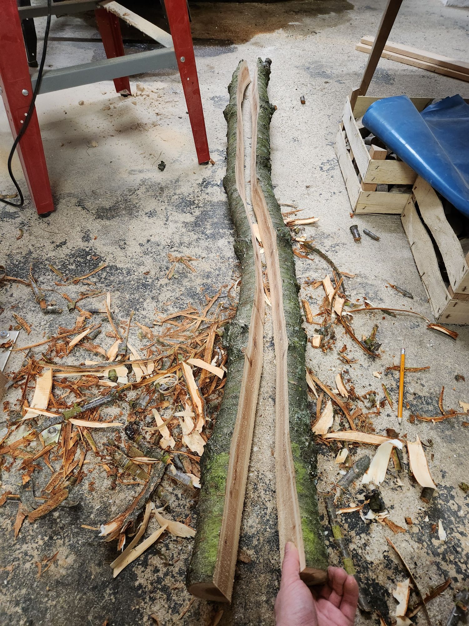 Die beiden Rohlinge vom ersten Baum sind stark verastet und ungerade, aber da es sich um eine Plantage handelt war mir schon im vornherein klar dass es eine Herausforderung wird. Beim zweiten Baum durfte ich dann noch einen dickeren Ast ernten. Da sollte man schon was draus machen können