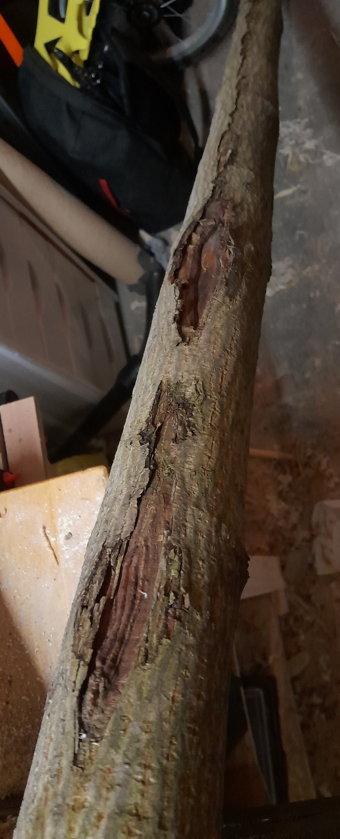 Mein Favorit war leider schon tot, deshalb wurde's ein anderer, der nochmal dünner war, 3,5cm am dicken Ende. Mal gucken ob draus ein Bogen wird, und wenn doch, ob der die 30# schafft. Was tut man nicht alles für die Wissenschaft.