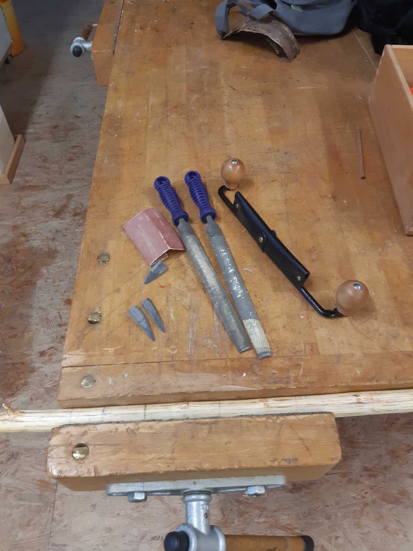 Vielleich mal lieber dickes Leder. Nein, nicht auf den Bogen. Auf die Klemme von der Schnitzbank. Dann passiert das auch nicht wieder