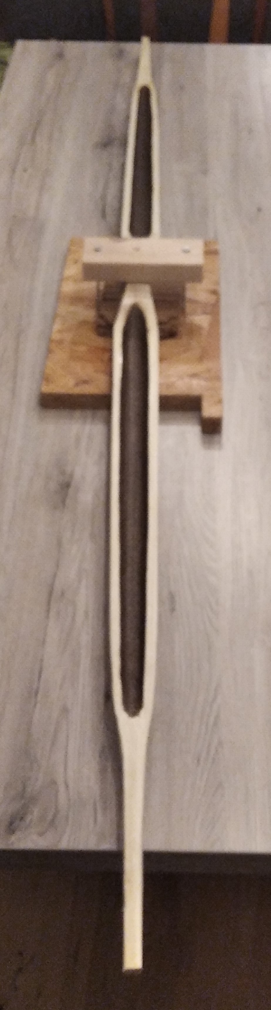Inzwischen habe ich die Wurfarme weiter ausgehöhlt. Eigentlich wollte ich mir ein Ziehmesser zum aushöhlen schmieden. Mangels Zeit habe ich mir eine Krücke gebastelt: