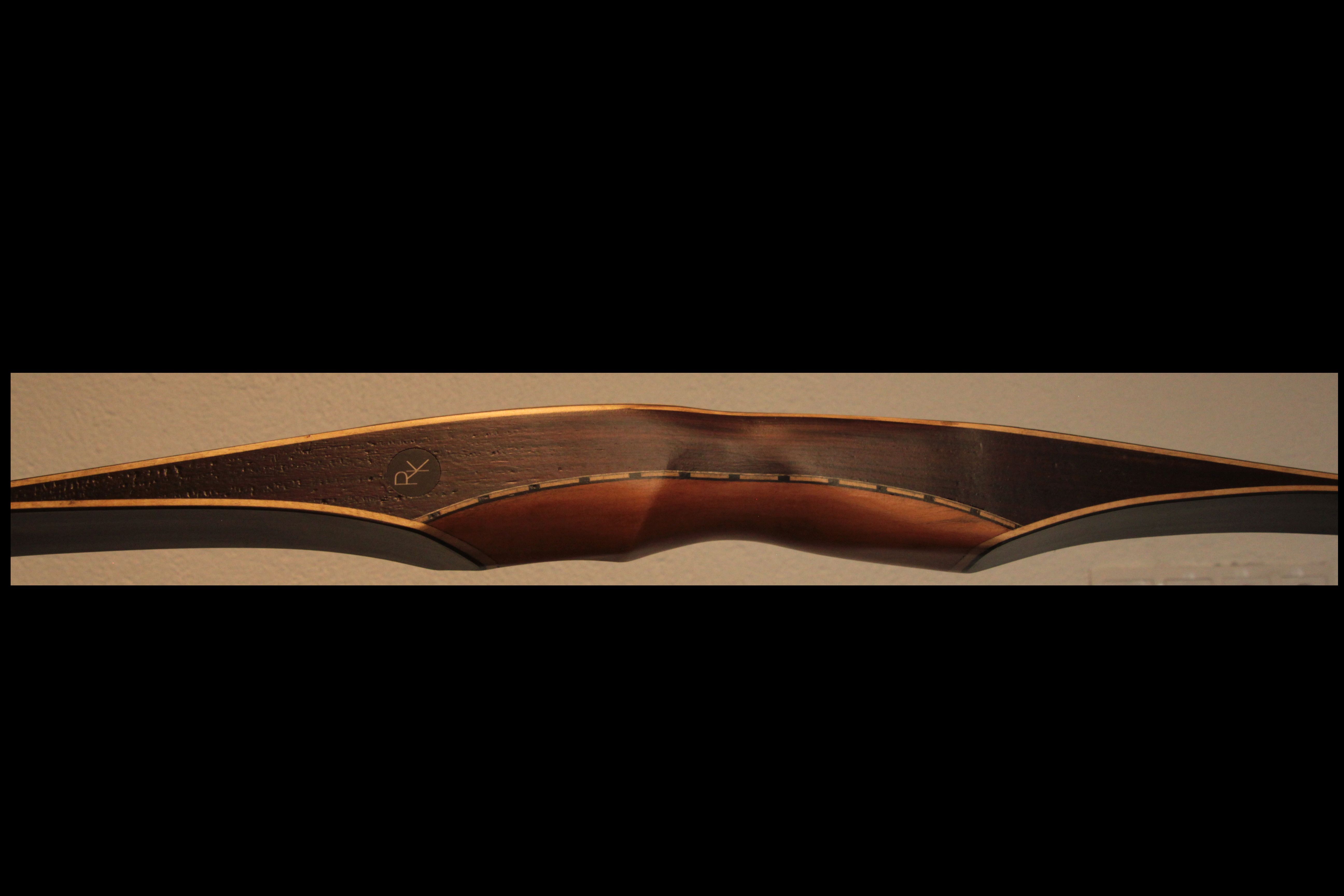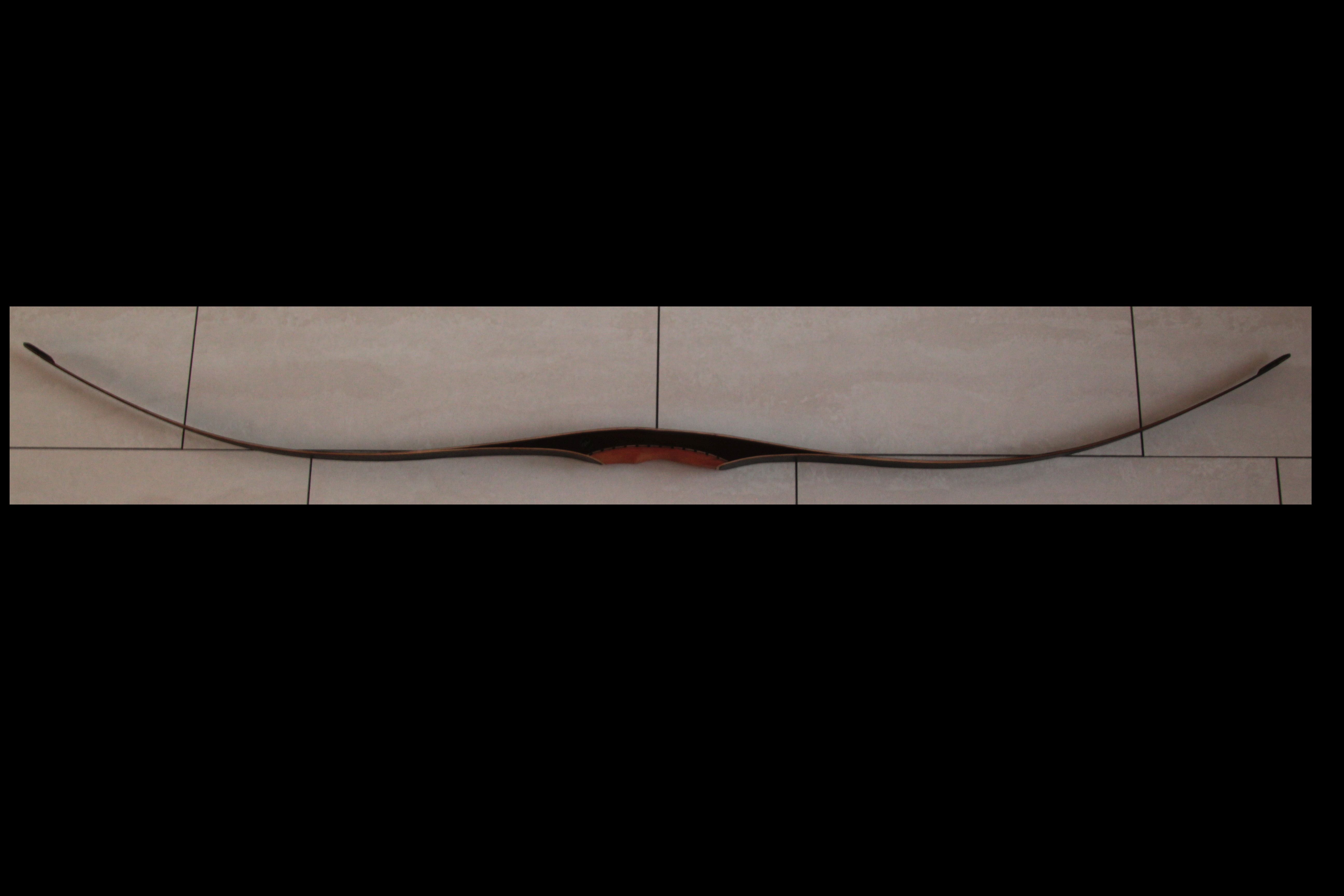 Der Griff ist aus Veilchenholz mit Birne und die Tips wieder aus schwarzem Büffelhorn mit roter Einlage. War gedacht als leichter Bogen und hatte entsprechend der Auslegung 26"@28". Am oberen WA muss ich noch etwas wegnehmen, damit er sich gleichmäßiger oben und unten biegt, dann bleiben wahrscheinlich noch 25lbs übrig. Ein wunderbarer Bogen fürs Wohnzimer Schießen aber auch auf dem Parcour kommt man gut zum 60m entfernten Büffel