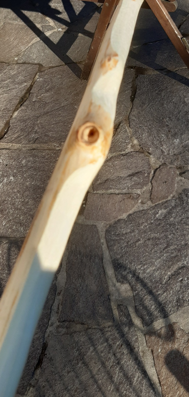 Gestern Abend Totäste und Risse mit uhu 300 gefüllt. Das ist die schlimmste Stelle: Dann gemerkt das die sehnenlage nicht mehr passt. Also heute morgen um 5. Einmal im Griff gebogen und gleich einen Riss eingefangen.