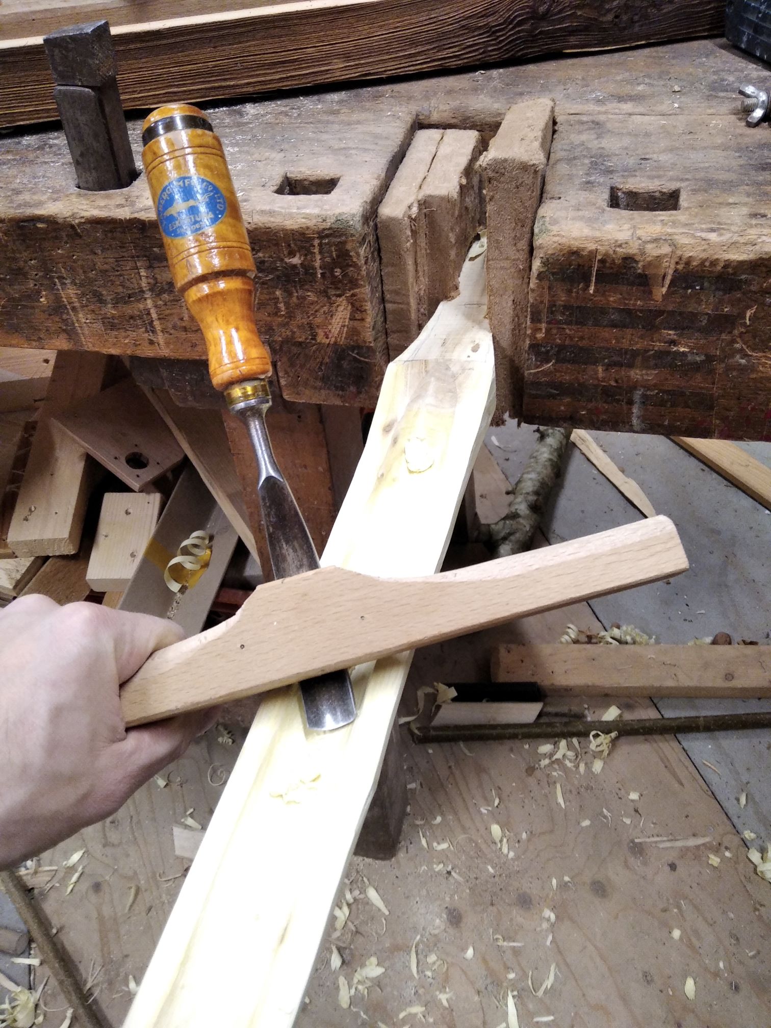Inzwischen habe ich die Wurfarme weiter ausgehöhlt. Eigentlich wollte ich mir ein Ziehmesser zum aushöhlen schmieden. Mangels Zeit habe ich mir eine Krücke gebastelt:
