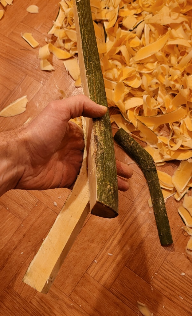 Heute Pfaffenhut geholt. Endlich schien Mal die Sonne. Da war ich so geblendet, dass ich vergessen hab für euch Fotos im Wald zu machen. Daher erst in der Werkstatt. Durchmesser 55 mm mit Rinde. Auf den Markkanal runter gearbeitet. Der Rücken liegt frei. Da kommen Hirschsenen drauf. Der Bauch ist noch mit Rinde bedeckt. Die Enden sind knubbelig. Der Rohling wird daher noch grob 16 cm kürzer. Dann bleiben etwa 140 cm.