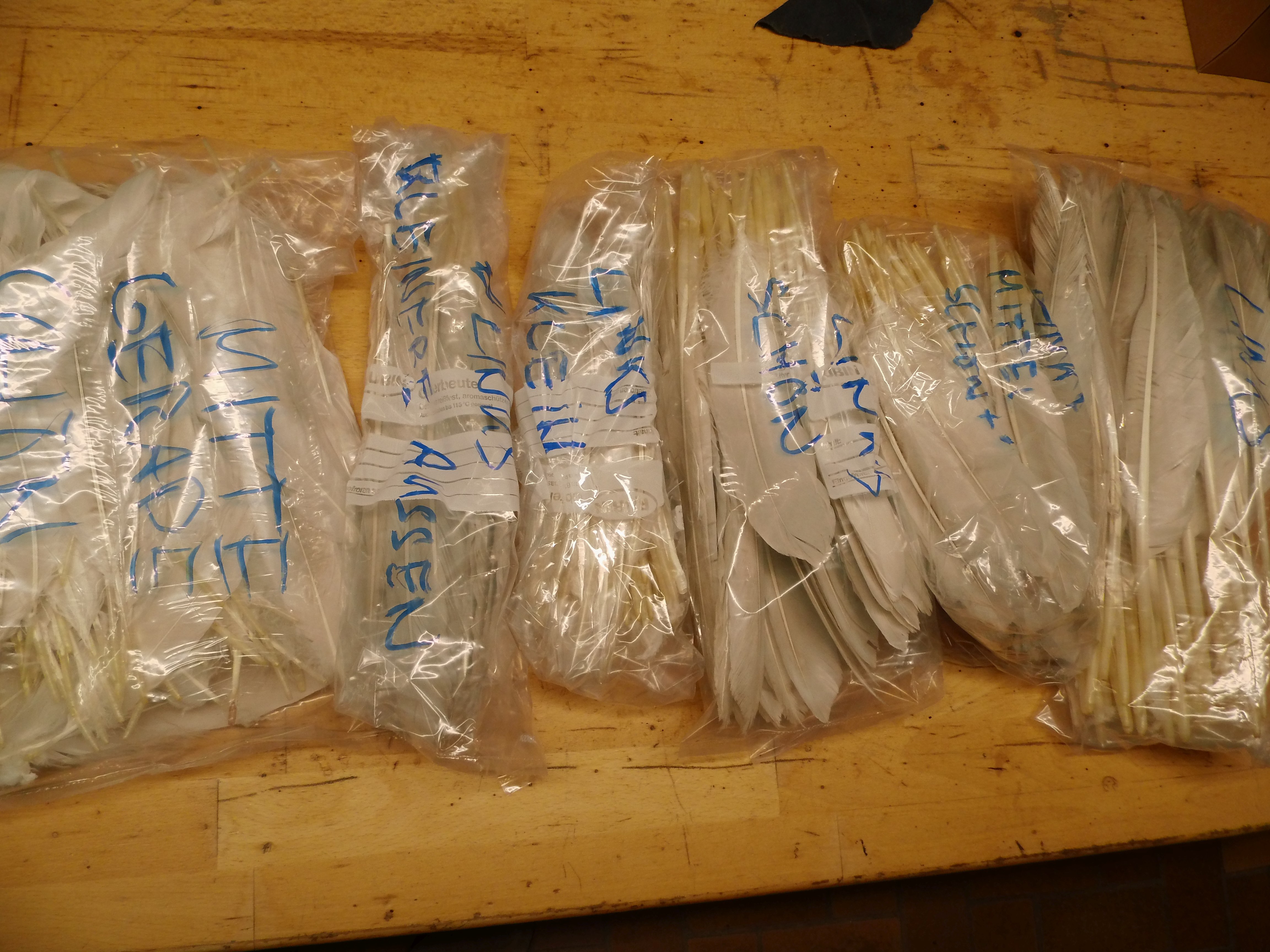 Die Federn in den Plastiktüten sind die linken Federn und ein Paket, wo ich nicht sehen konnte, ob rechts oder links, ziemlich mittige Ausrichtung meiner Meinung nach. Falls jemand die Plastiktüten-Federn gern hätte, ich bin auch gern bereit zu tauschen. Vielleicht habt Ihr ja etwas interessantes für mich.