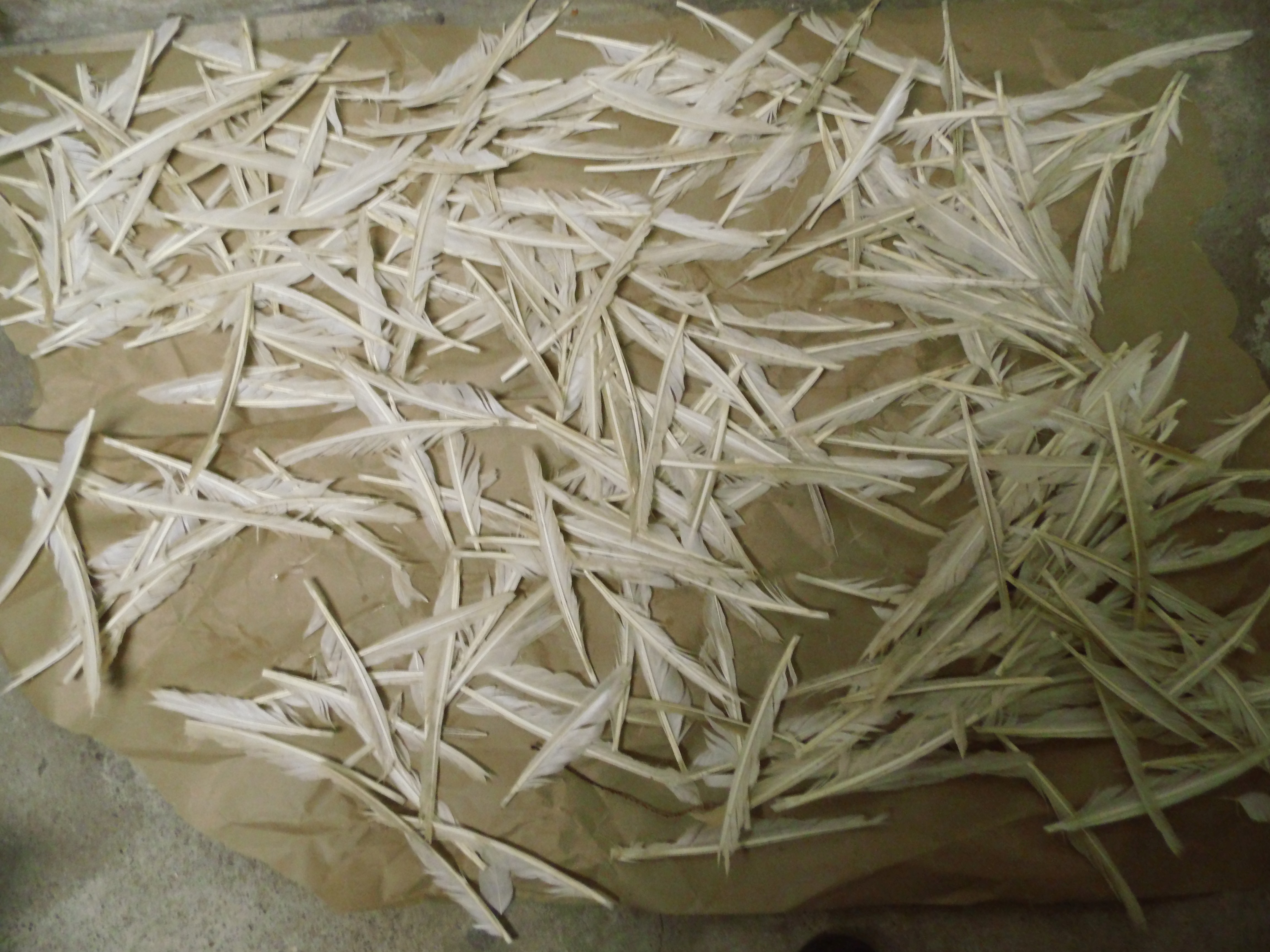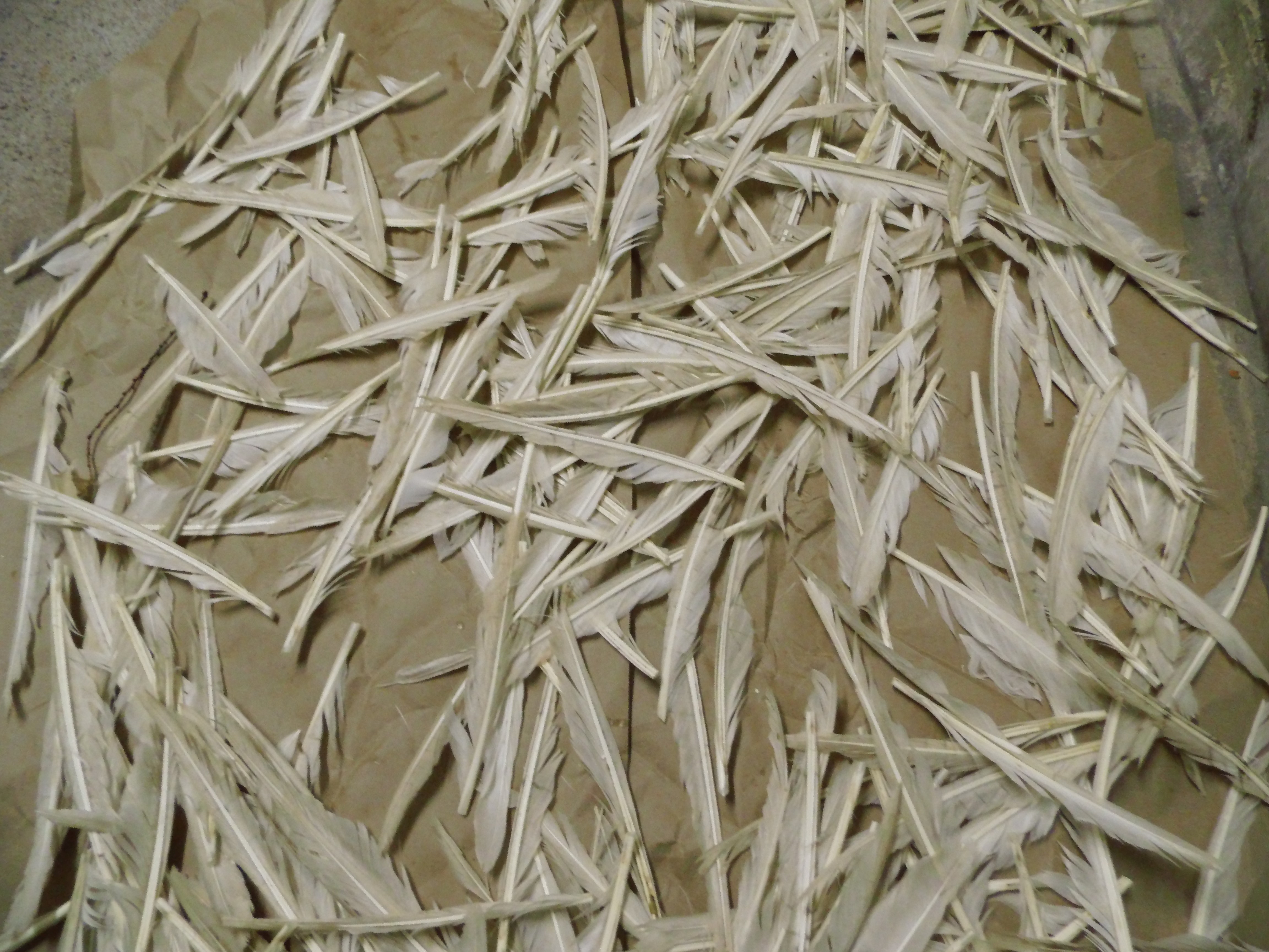 jetzt mal ein paar Bilder von der "Feder-Ernte". Ich habe die Gänsefedern ungefähr an Weihnachten erhalten, nass und unsortiert. Ich habe sie dann sortiert und unter regelmäßigem Wenden getrocknet. Danach haben sie über 5 Wochen im Eisfach in Plastiktüten verbracht. Heute habe ich die rechten Federn in den Schrank sortiert... ich vermute jedenfalls, dass es die rechten sind :-)