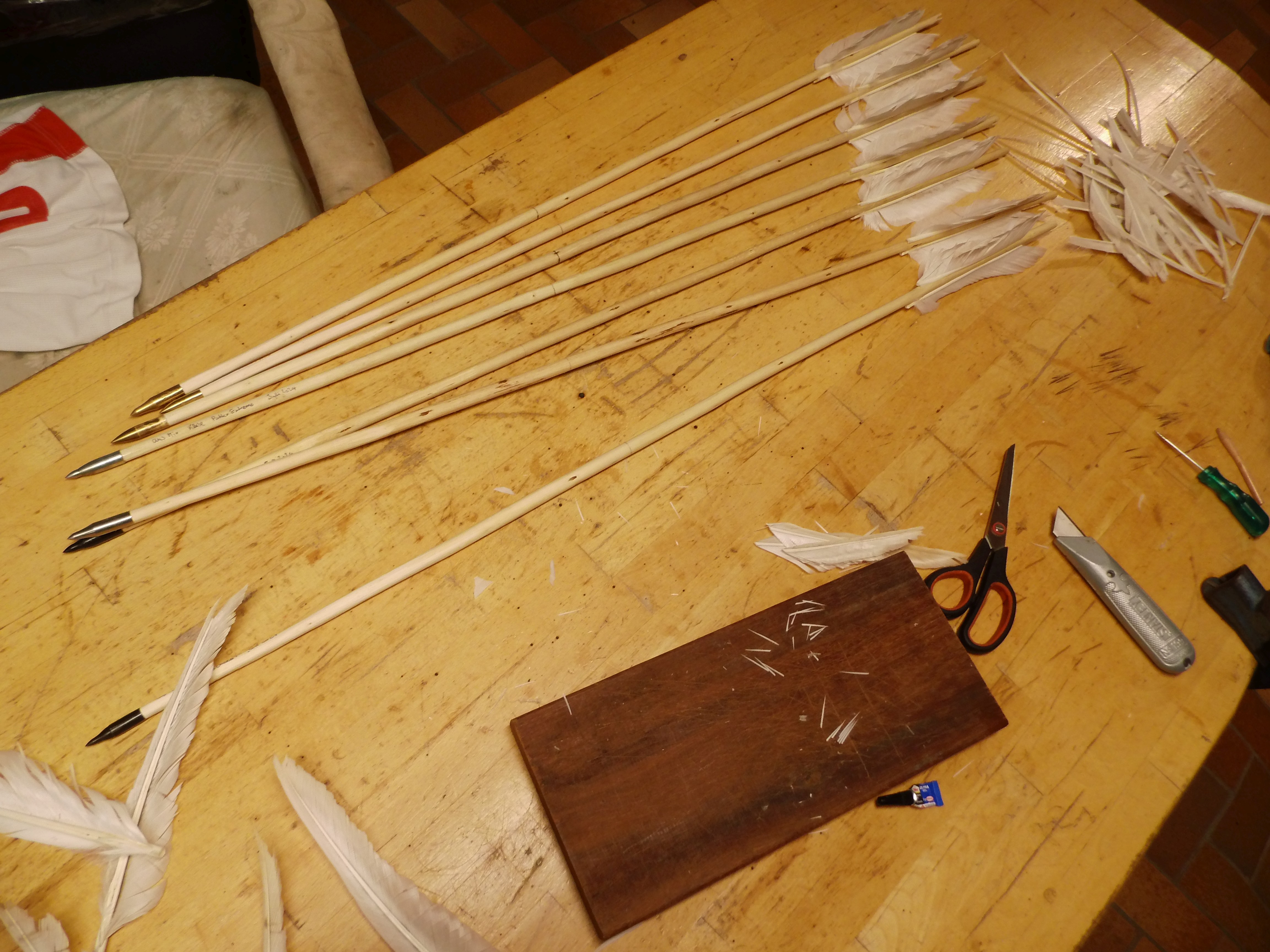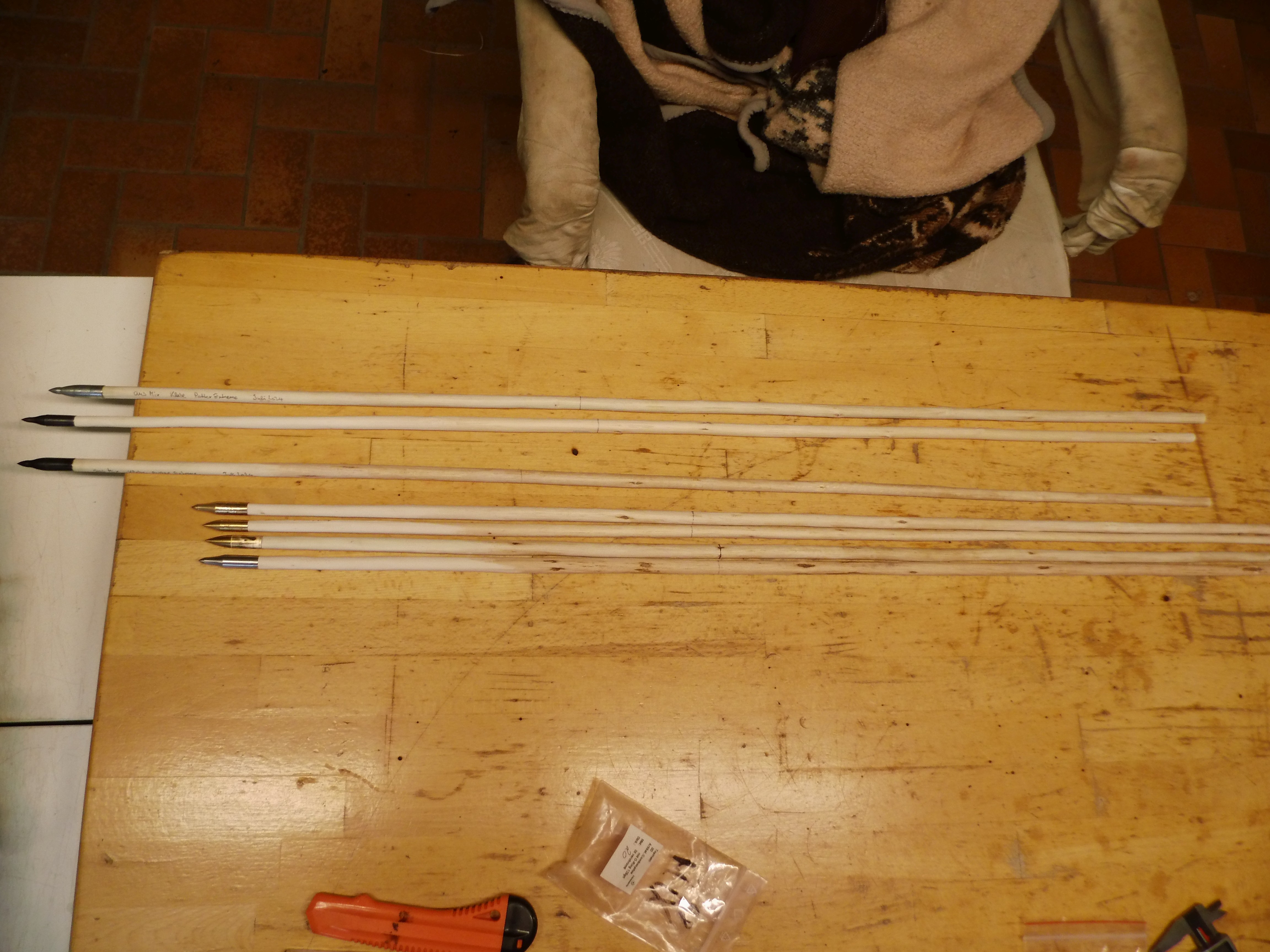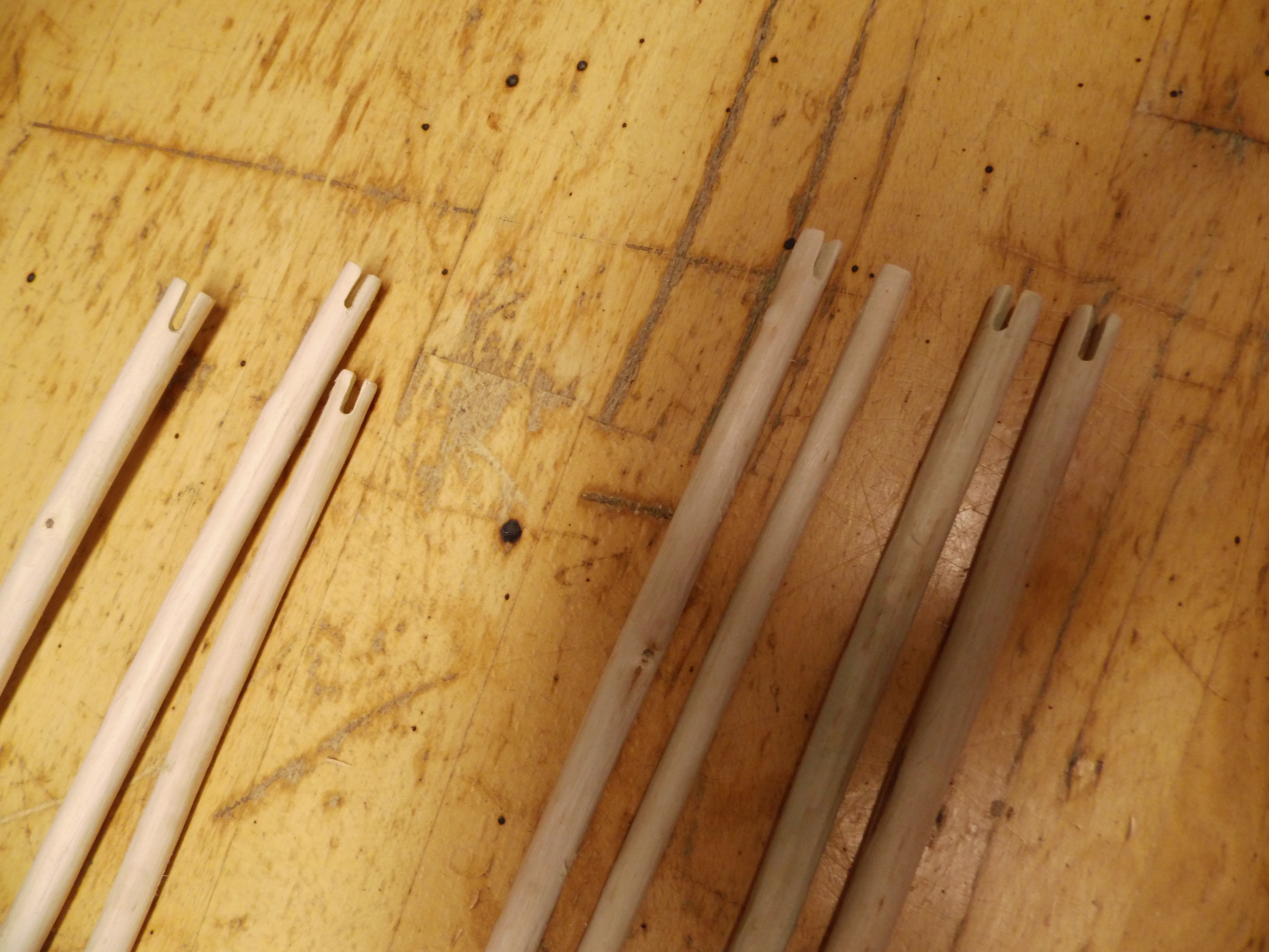 hier mal ein kleines Update. Habe diese Woche sieben Pfeile hergestellt, alle sind aus der diesjährigen Ernte. Ich habe sie noch nicht geschossen, aber ich bin optimistisch, dass sie besser fliegen als meine bisherigen. Man lernt :-) Die Reihenfolge der Bilder müsst Ihr Euch rückwärts denken.