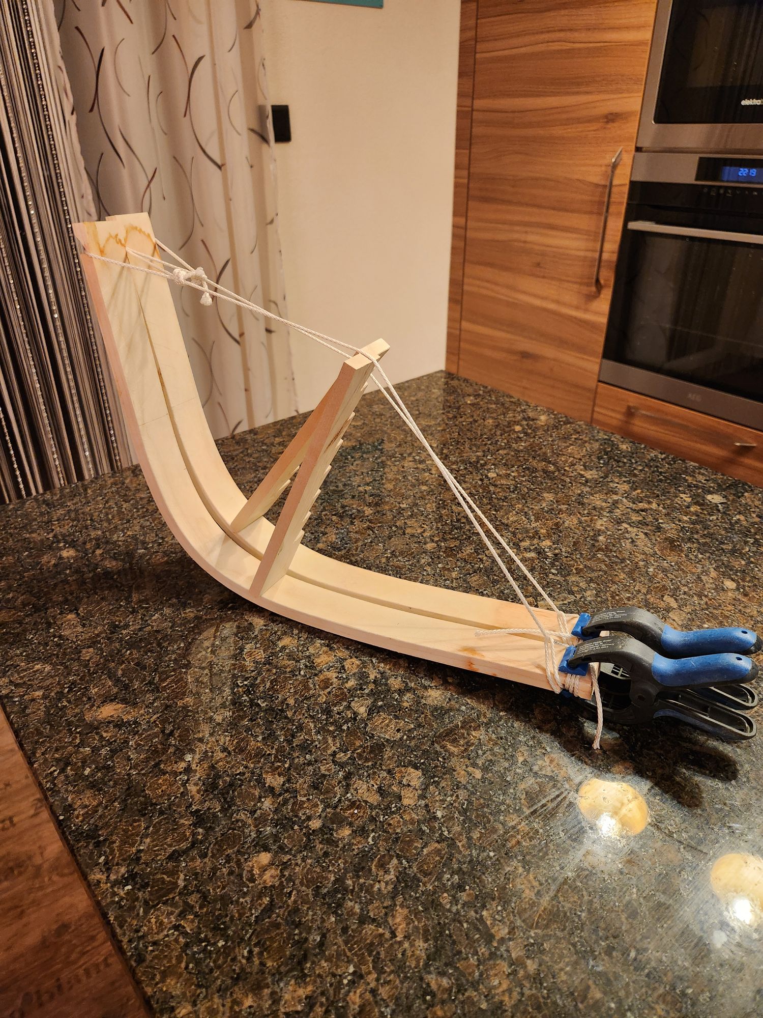 Oder vielleicht kann ich das frische Holz gleich Nass biegen und dann wie bei den anderen auch mit der Schnur und dem gezahnten Stock in Form halten während es trocknet.