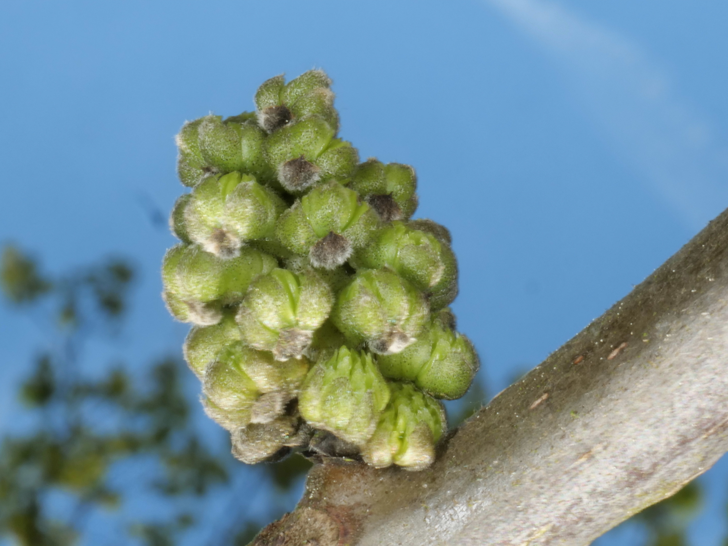 Ja, alles richtig, nur nicht verkehrt herum, aber so einfach wollte ich es nicht machen. Es ist die Knospe der männlichen Blüte, die oft oben auf den Zweigen sitzt, sich dann auswächst zu diesen langen Kätzchen und seitlich herunterhängt. Diese Knospe ist schwer im I-Net zu finden. Bei mir hatte der Frost alle männlichen Blüten und Blätter schwarz werden lassen. Die weiblichen Blüten sehen anders aus und kommen später, unbeschadet vom vergangenen Frost.