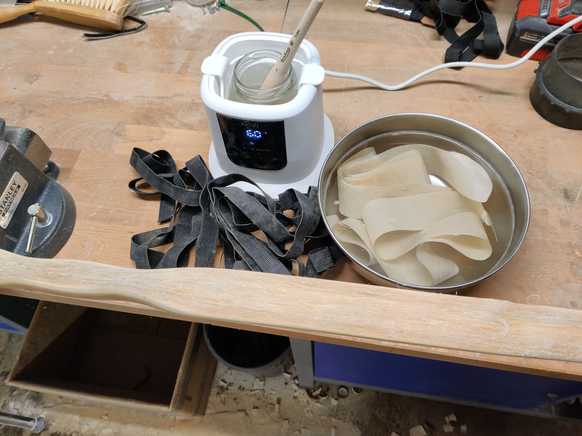 Nun ist das Rohhautbacking beim Eibe-Recurve aufgebracht. Dafür hab ich den Bogen einmal frisch angeschliffen und entfettet. Dann 25%igen Hautleim angemischt, damit 2mal Grundiert und im Anschluss immer 5-10cm frisch mit Kleber eingestrichen, Rohhaut drauf, Luft ausgestreift und 3 Wicklungen mit dem Hosengummi gesetzt. Dann Rohhaut wieder angehoben und wieder ein Stück eingestrichen usw. Am Ende nochmal mit dem Haarfön erwärmt um ein ordentliches verbinden sicher zu stellen und fertig.