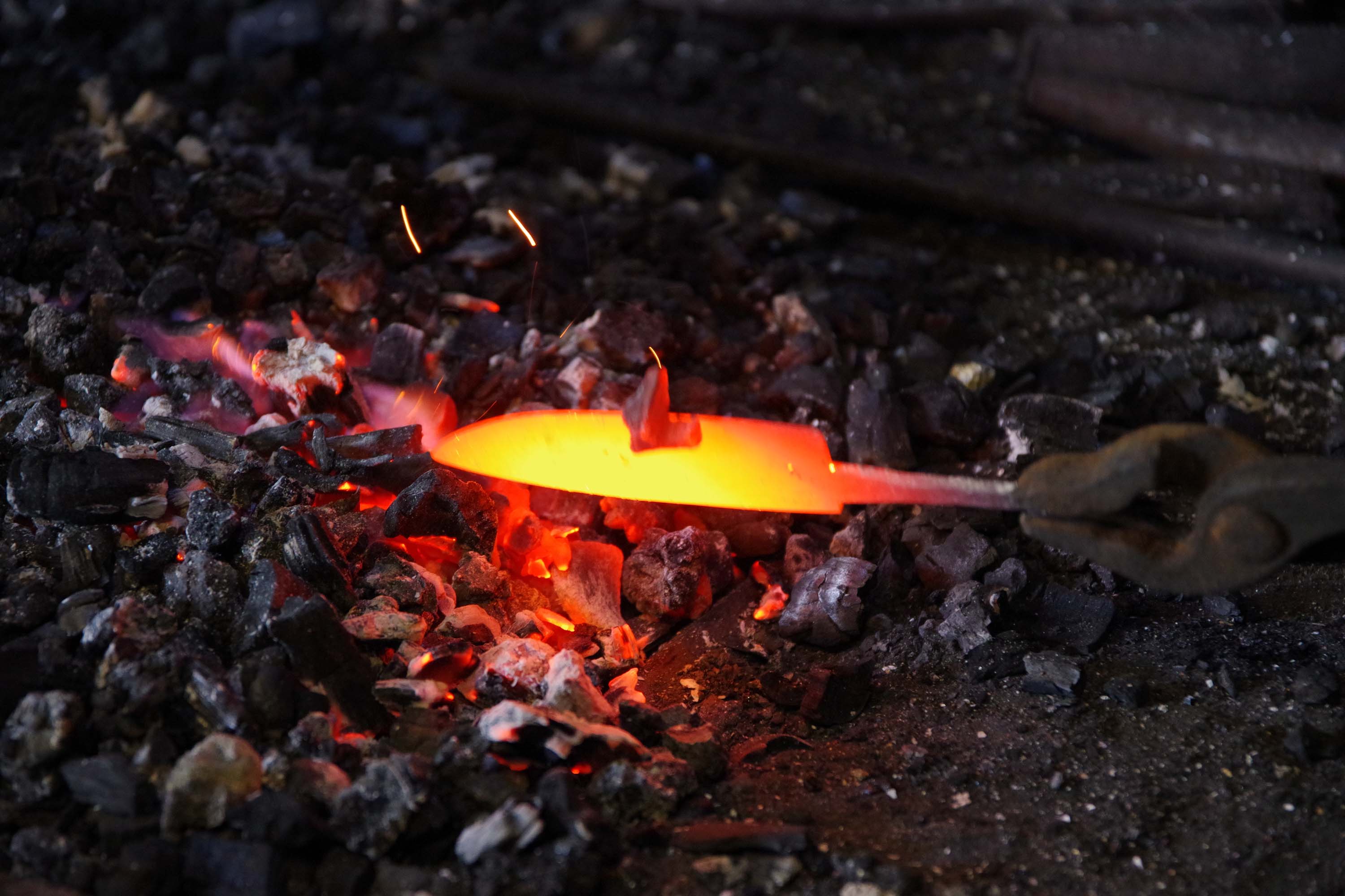 Das Verschweißen geschah ohne Flussmittel. Wir haben den Klumpen nach Augenmaß auf eine gewisse Temperatur (Farbe) gebracht und dann schnell und kräftig mit zwei Hämmern abwechselnd geschlagen. Wenn dabei flüssiges Metall weg spritzte (die Funken im 2. Bild), war das ein Zeichen dafür, dass es wohl funktioniert hat.