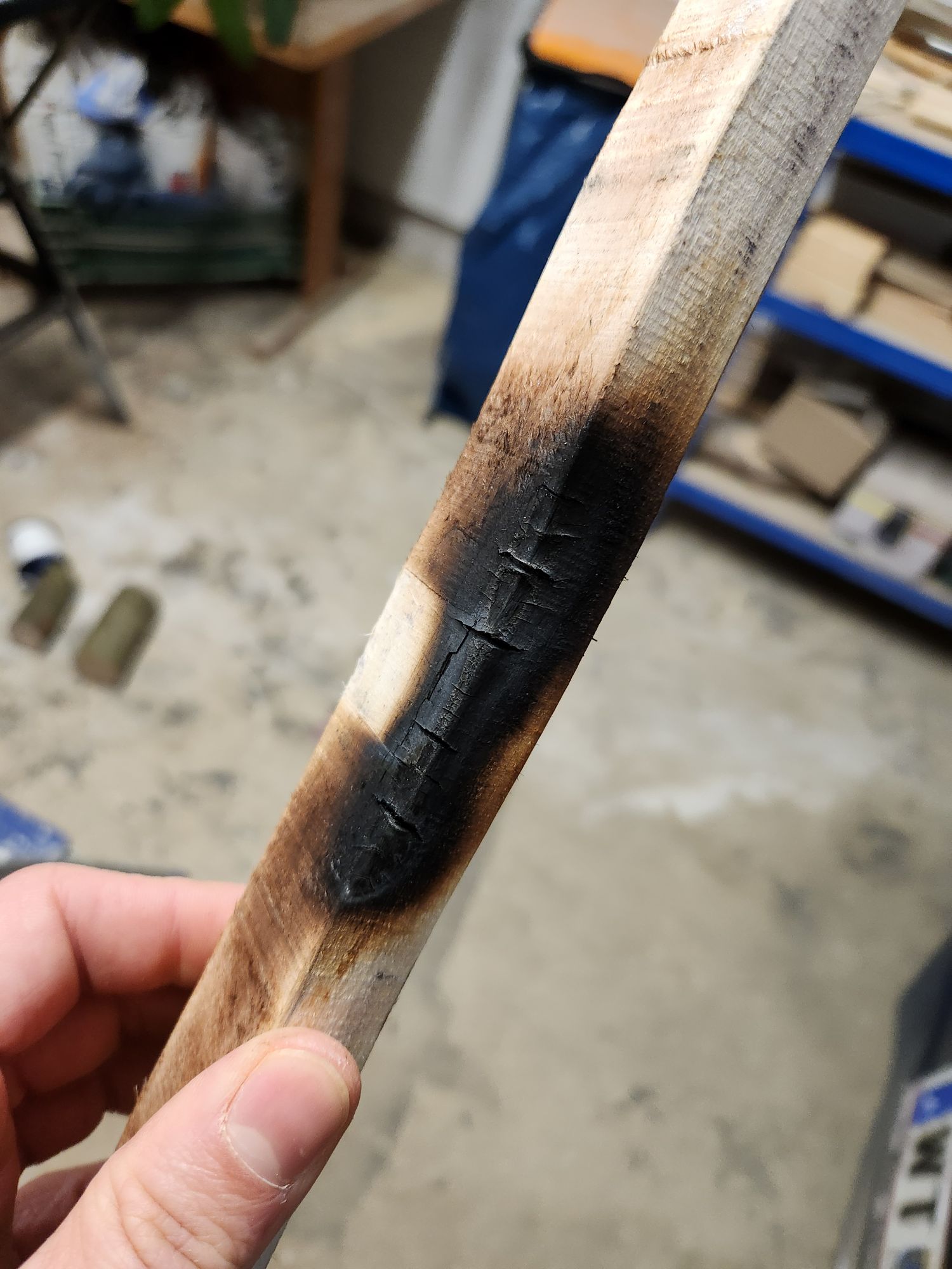 Da ist zu viel verkohlt, schaut aus, als würde die verbrannte Stelle bis zum Bogenrücken reichen. Warum hast Du den Bogen nicht vorher bis Standhöhe fertig getillert? LG Stephan