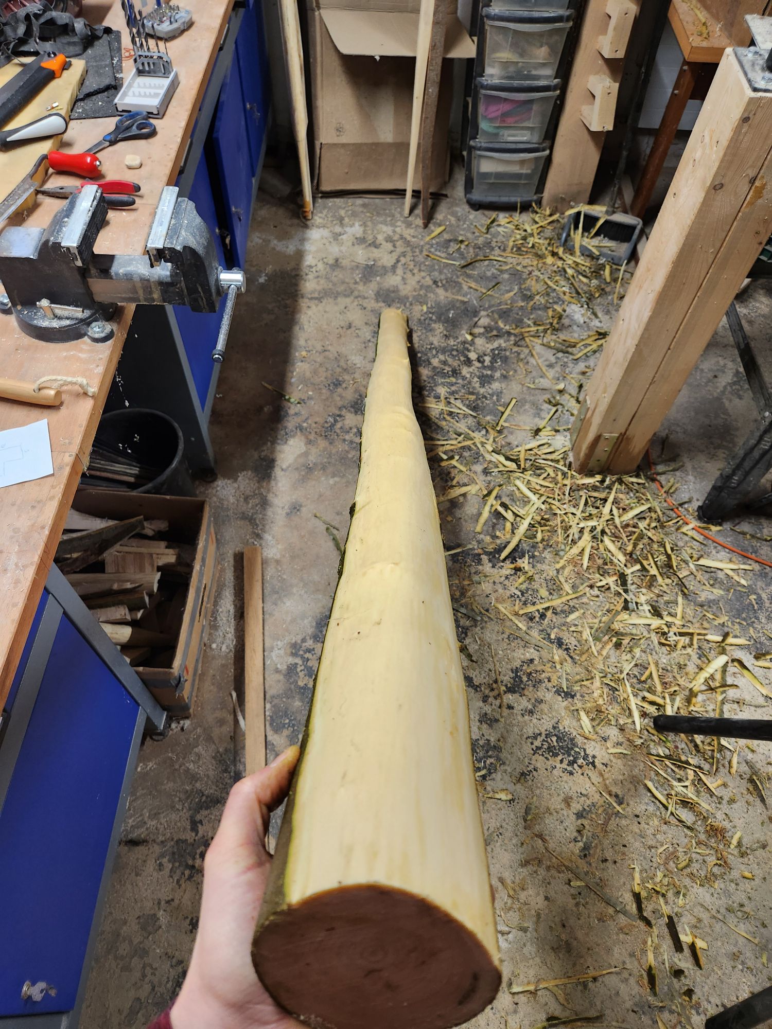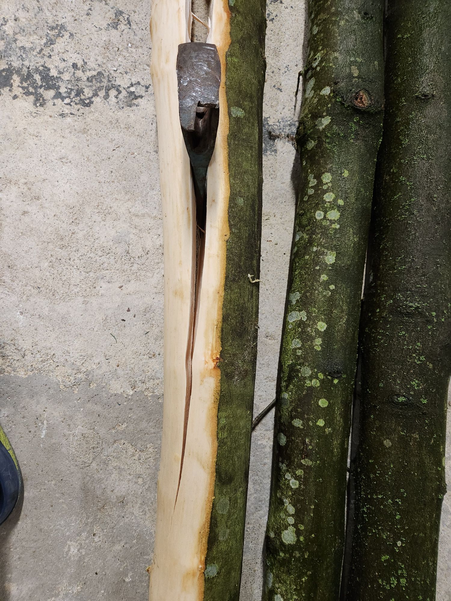 Die andere Hälfte des Staves ist nämlich noch freier von Ästen, ist hald nur ein wenig Deflex. Also hab ich die jetzt auf 1,9m gekürzt, entrindet und einen Halbpyramidalen Bogen mit einer Verjüngung von 4cm auf 2cm aufgezeichnet. Hier sind mir aber beim entrinden einige komische "Male" aufgefallen. Weiß jemand was das ist und ob das Probleme machen kann? Davon sind mehrere über die ganze Länge verteilt. Auf der anderen Hälfte war mir sowas nicht aufgefallen. Ich hab dann die Enden aller 3 Rohlinge versiegelt und alle in der Garage liegen gelassen da es draußen zu Nass ist.