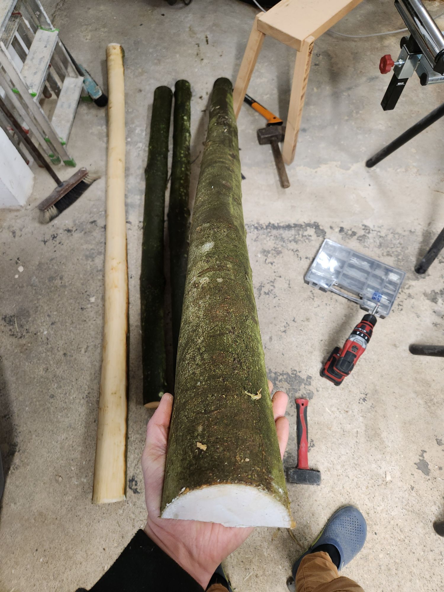 Beim langen Stave hab ich noch die Rinde entfernt und die Enden versiegelt. Die anderen sind noch unberührt und alle liegen fürs erste draußen.