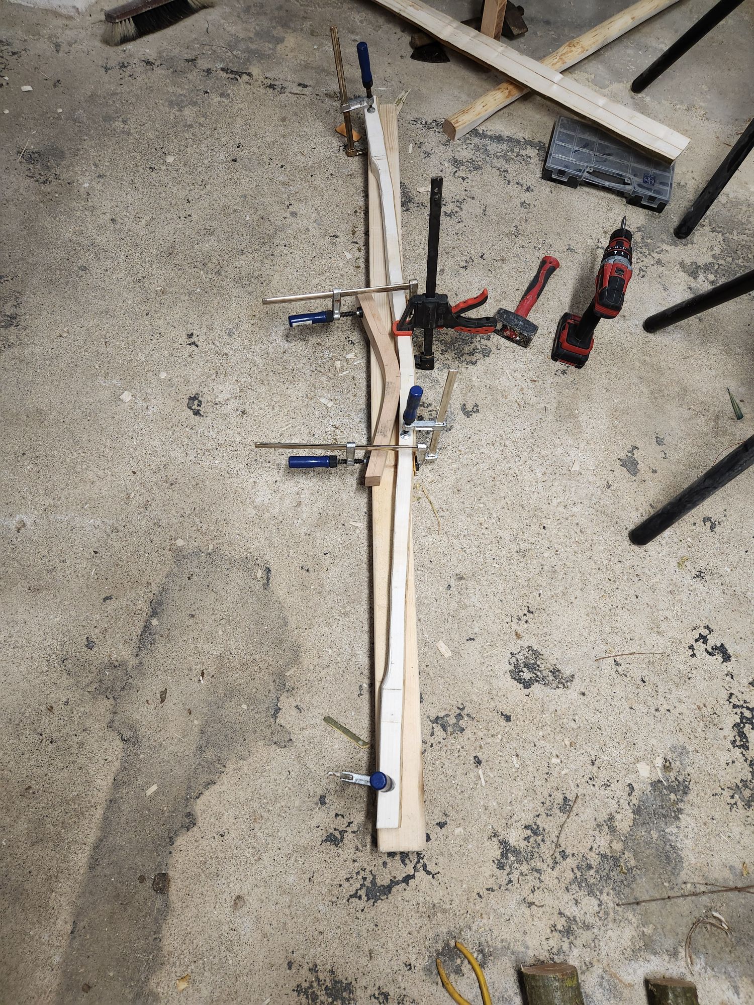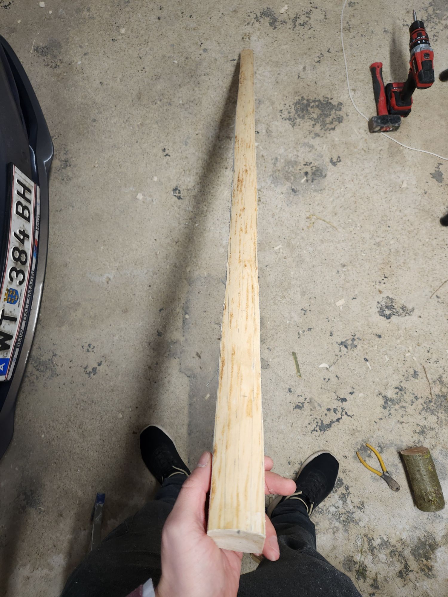 Wie schon erklärt musste ich dafür meinen Hauptrohling opfern. Ich hab ihn erstmal als ganzes 45mm breit und Schnurgerade ausgeschnitten. Dann auf 1,6m gekürzt und an den Seiten die gewünschte Form aufgezeichnet. Zuerst an den Enden 20cm lang und 3cm dick und dann einen Groben Taper von 25mm im Griff auf 20mm vor den dickeren Gabeln.
