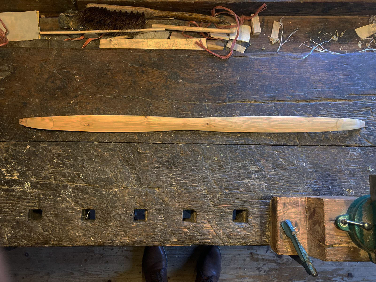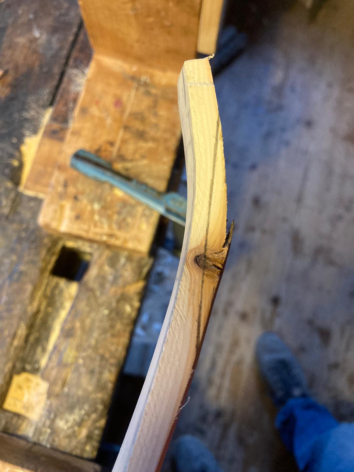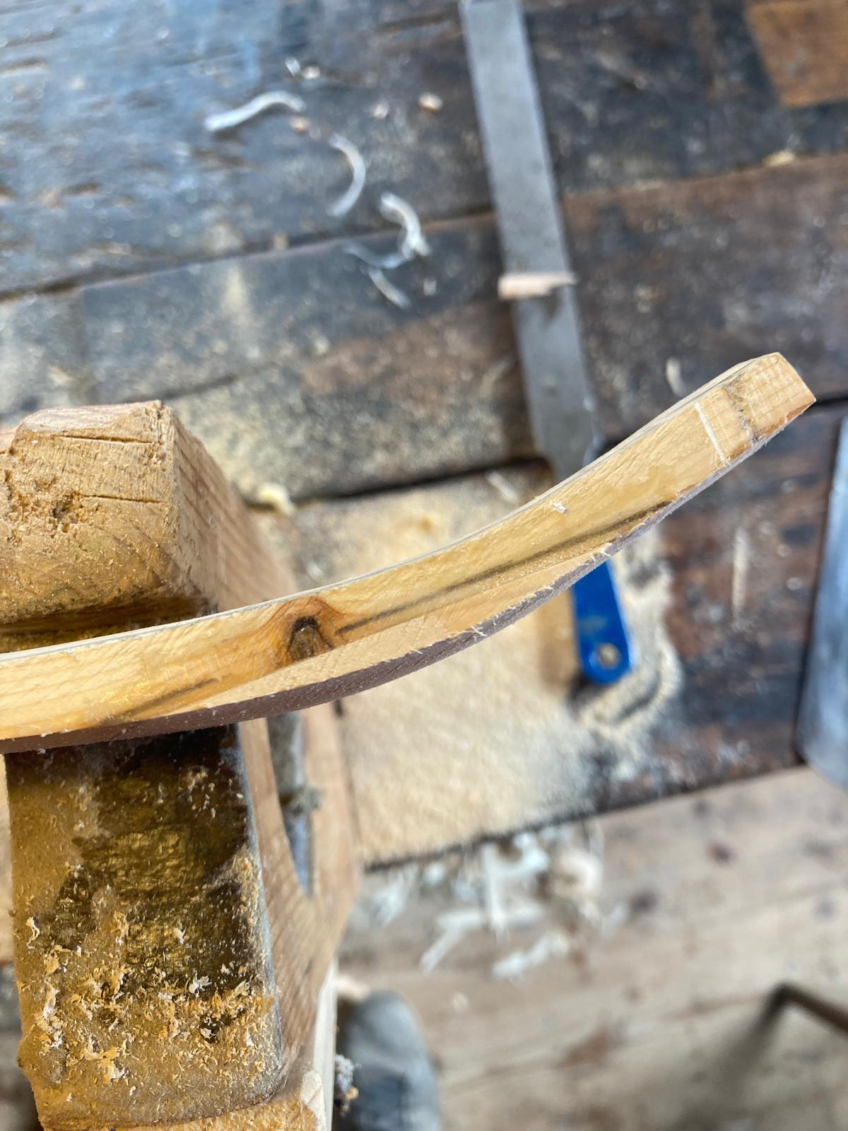 Der Bogen ist fertig vorbereitet für das Sehnenbacking. Die Dicke in WA Mitte beträgt mittlerweile 8 mm. Am Montag werden die Sehnen aufgebracht und nach der Trocknungszeit wird sich zeigen ob das Ding ein Bogen wird.