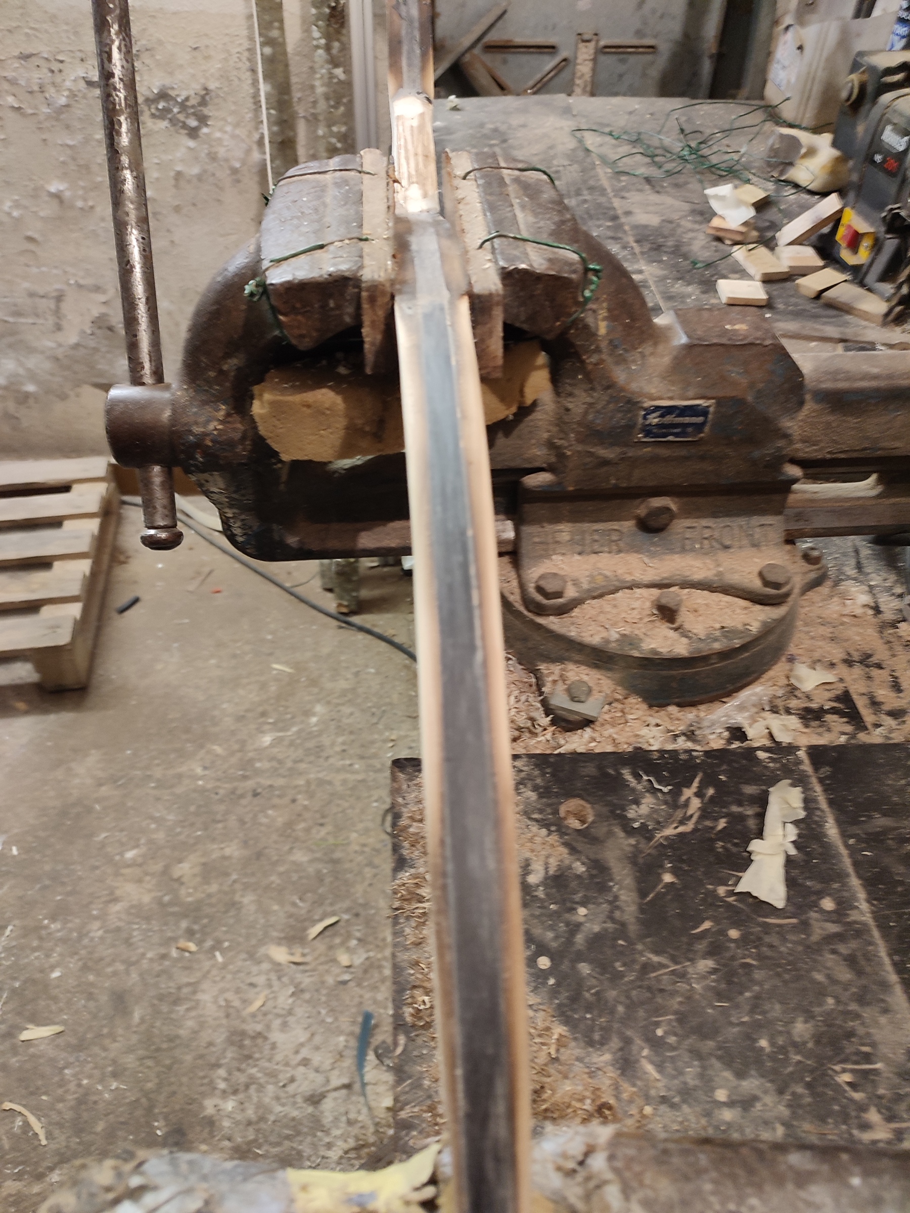 Heute bekam der Bogen die Form, sowie die Nocken. Er wiegt jetzt 311g bei einer Länge von 125cm NtN. Wenn alles so bleibt sieht es richtig gut aus. Der Bogen ist bolzen gerade