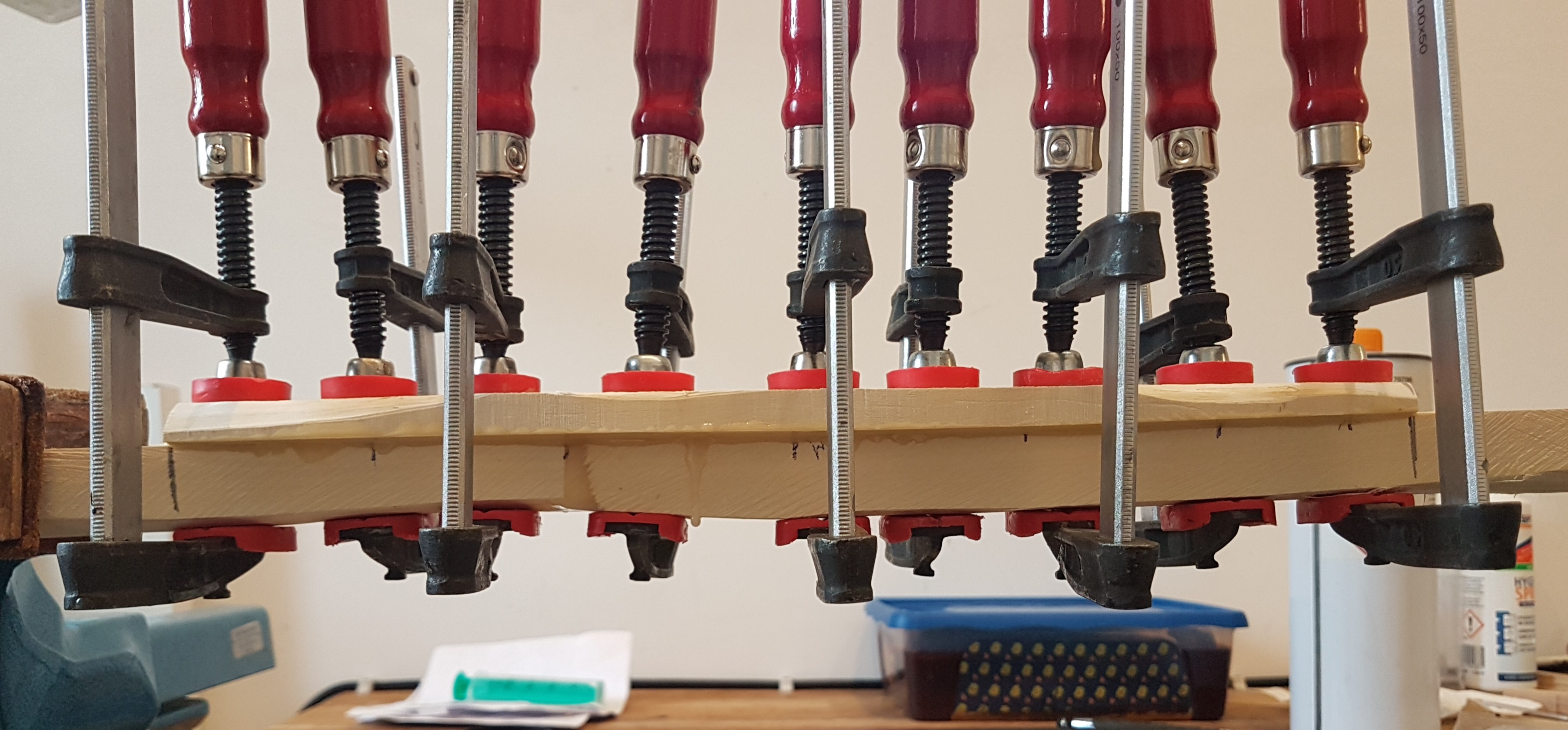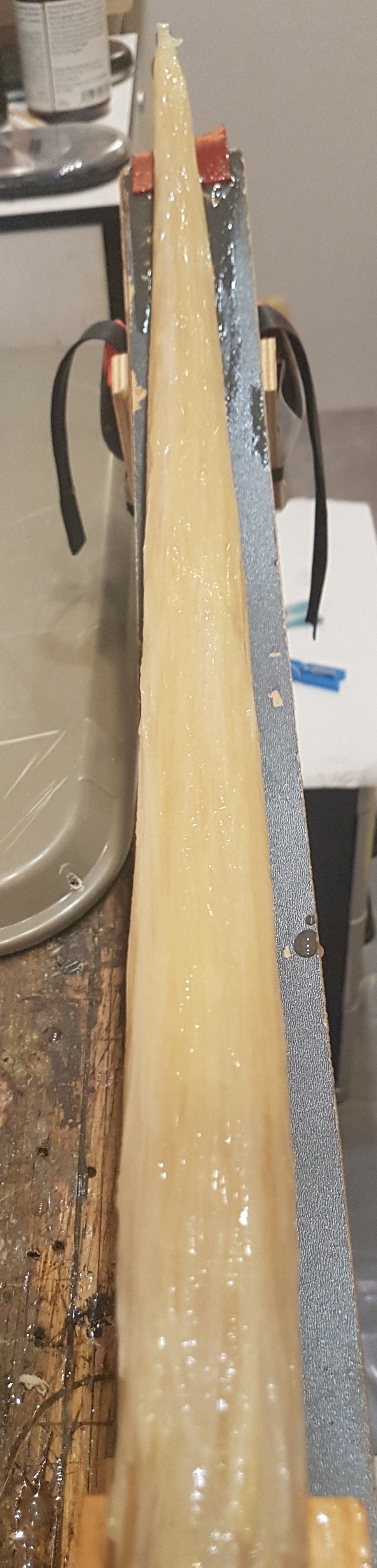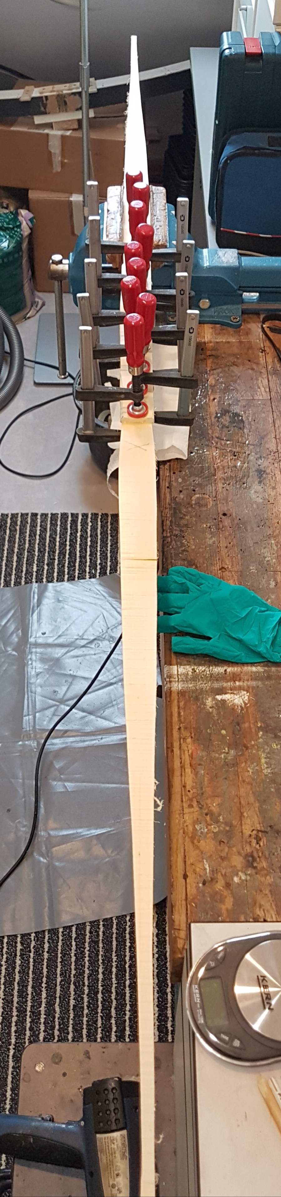 Bogen 02 lang. Gestern Abend hatte ich die Spleiße mit Hilfe der Bandsäge geschnitten. Da die Schnitte mal wieder nicht gut waren und meine Mittellinie nicht optimal gewesen wäre, habe ich die Spleißteile noch etwas nachgeraspelt und eben gerade mit Epoxyd geklebt. Jetzt stimmt die Mittellinie wieder.