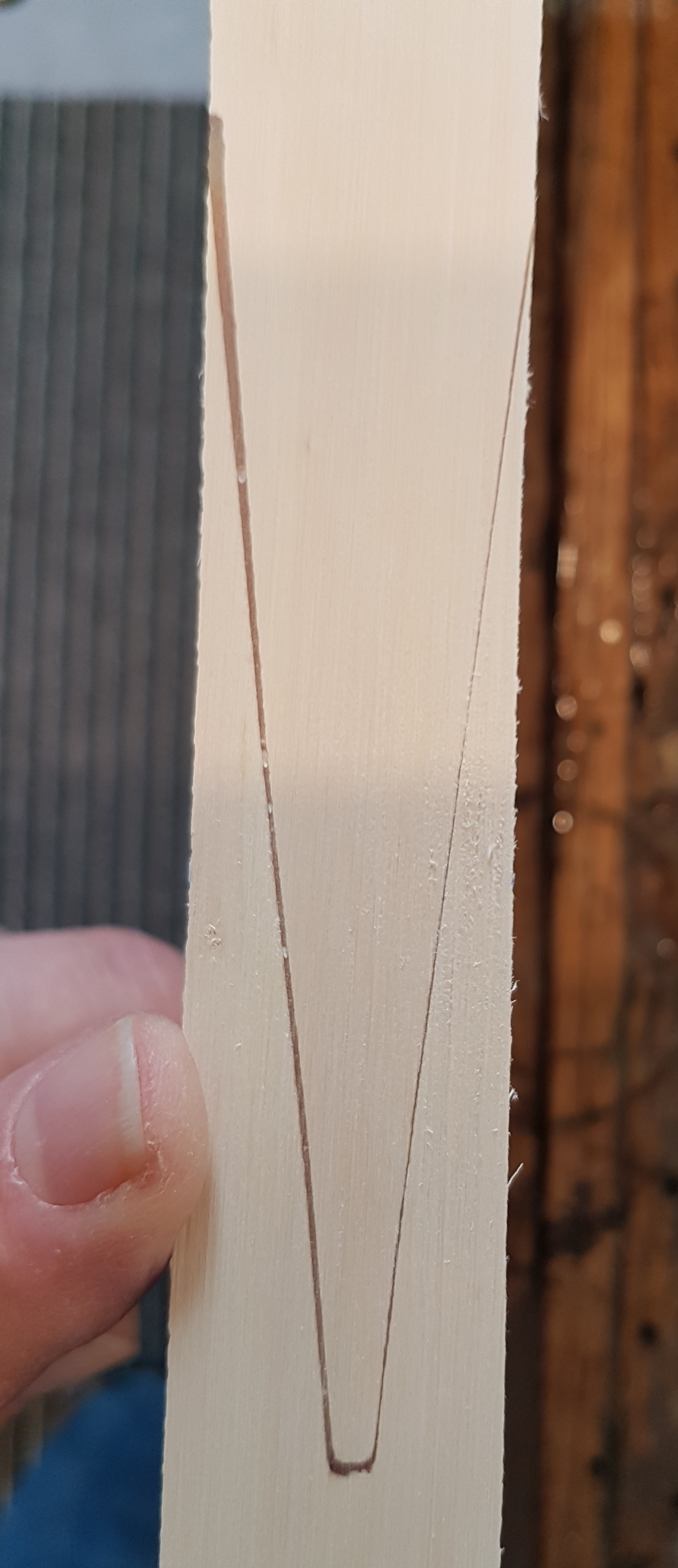 Bogen 02 lang: mittlerweile wurde die Seitenlinie fertig ausgearbeitet. Da der Mittenbereich in einem kurzen Stück zu dünn war, habe ich eine Aufdopplung aufgeklebt. Praktischerweise hatte ich noch die zweite, deflexe Hälfte vom kurzen Bogen übrig - zwar noch nicht 100% trocken aber ausreichend um ein Stück abrichten zu können und zu kleben.