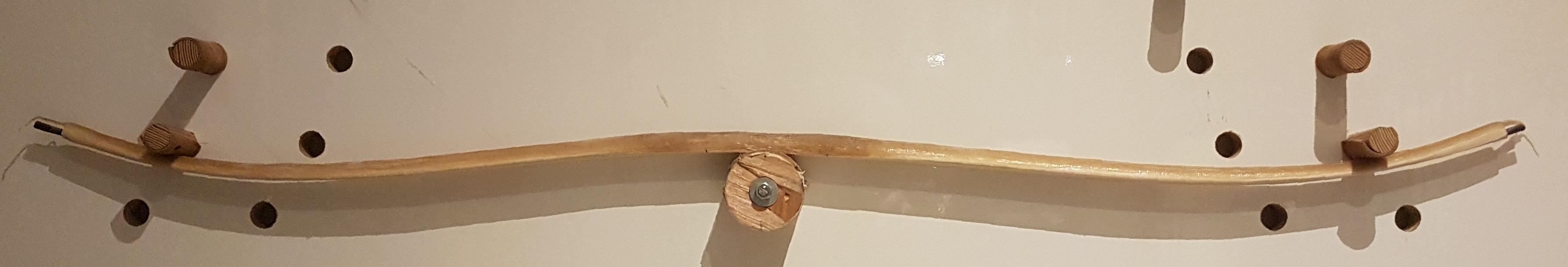 Bogen 02 kurz: Heute durfte der kurze mal das biegen lernen. Auf meiner Stiftwand mal kurz angebogen und sofort wieder abgenommen, da sofort klar war, dass noch einiges an Holz weg muss. Heute habe ich ausnahmsweise und weil's schon draußer schon dunkel war den Bandschleifer bemüht. Danach wieder eine Biegeprobe.