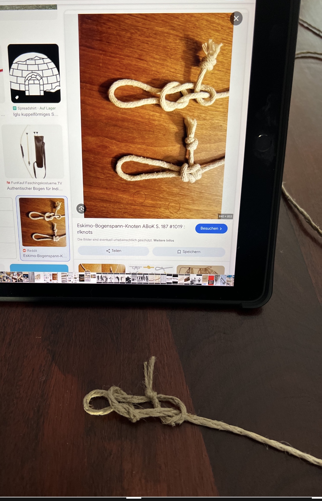 Der Bogen hat jetzt eine Sehne aus geflochtener Juteschnur bekommen. Originalgetreu mit einem Inuit Bogenknoten. Griff aus einem Lederstreifen, der Rohhautstreifen war nicht angenehm. Die Lederenden unter dem Kabel verklemmt.