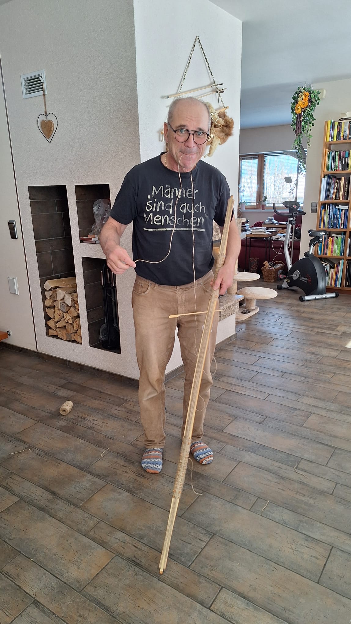Hier habe ich keine Juteschnur verwendet, sondern zwei 40m lange gewachste Leinenfäden mit der Bohrmaschine verdrillt. Geteiltes Kabel, 10 Stränge über die gesamte Länge, 16 von Knie zu Knie, (insgesamt somit 26x2 Fäden, weil ein Strang besteht ja aus 2 Fäden), der Kabelteiler ist aus dem ausgeschiedenen verzogenen Holunder gesägt. Damit hat sich der Holler auch verewigt, wenn er schon kein Bogen werden wollte. Jetzt kommt noch ein Griff aus einem Lederstreifen und eine gedrehte Leinensehne.