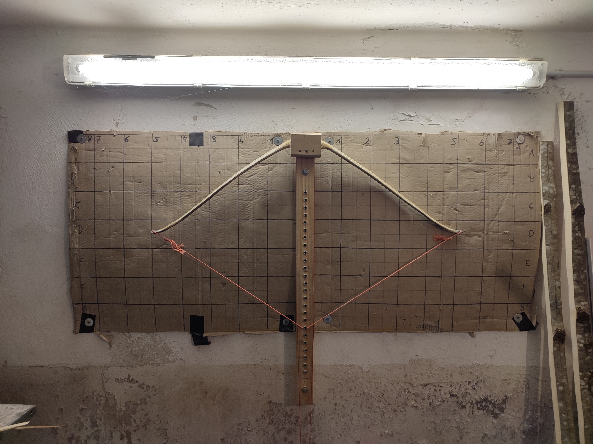 So heute habe ich ein Wenig getillert...der Tiller könnte oben (links)weniger mitten Biegung vertragen, dass ist in der Kürze der Zeit nicht mehr zu korrigieren. Auf dem Bild sieht es schlimmer aus als es ist, da der Bogen schräg fotografiert wurde und damit die rechte Biegung nicht so gut sieht. Bin gespannt auf das Bild mit Pfeil. Standhöhe ist bei 20cm, sonst liegt die Sehnen zu stark auf den Wurfarmen auf.