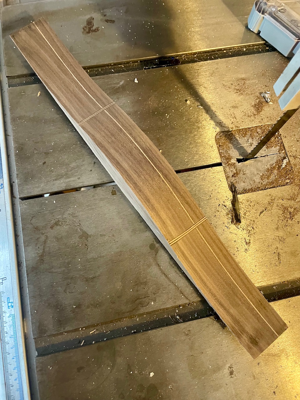 Das Furnier alleine ist zu fragil, um es zu füllen und zu wellig, um es zu schleifen - ich müsste also als Zwischenschritt zuerst das Furnier mit dem Bambus oder Ahorn laminieren, dann füllen, leicht schleifen und dann im Bogen verwenden. Ich lasse es mal sacken.