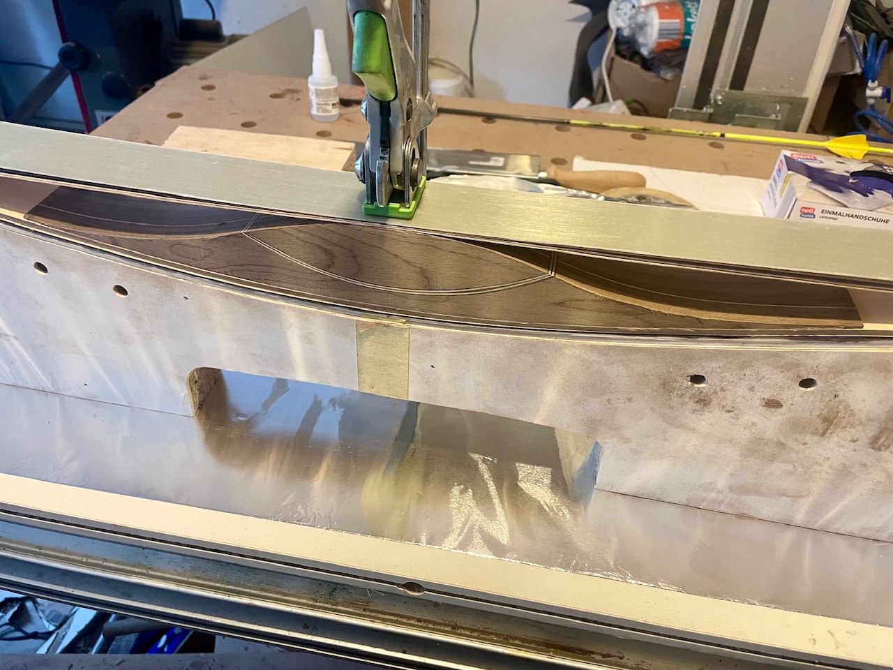 Der Pressdruck sollte auch ausreichend sein, es sind insgesamt 38 Zwingen, die ich wirklich ordentlich angezogen habe. Der Druck wird von einer Lage 5mm Vinyl auf einer Lage 3mm Dibond in den Bogen geleitet und die Form ist mit 3mm Forex gepolstert.