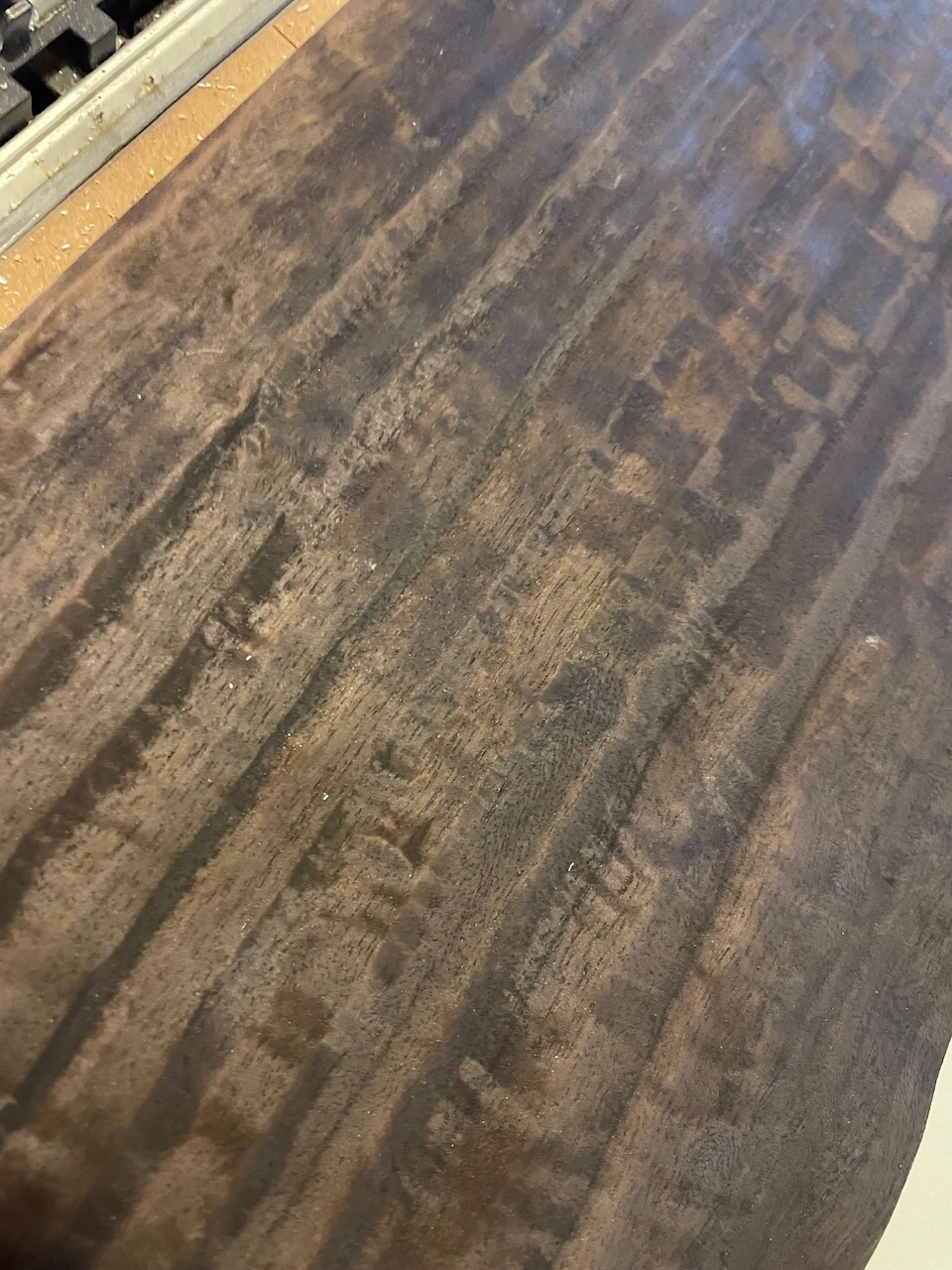 Das Furnier ist deutlich grobporiger und durch die Riegelung auch leicht wellig - ich gehe davon aus, daß ich hier den Kleber besser warm gemacht hätte, um ein tieferes Eindringen zu erreichen.