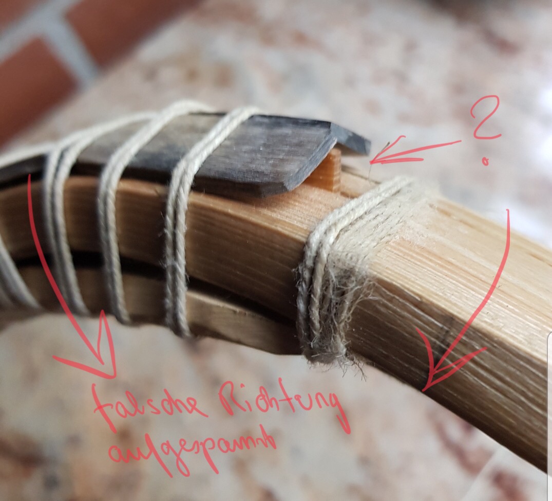 So wie das Horn durch den Spitz des Spleißes gebrochen ist, musst Du ihn verkehrt herum aufgespannt oder gespannt haben !?! Oder hast Du den Bogen als Stock benützt? Wenn man den Bogen normal spannt drücken die Spitzen immer in Richtung Bogenrücken.🤭🫣
