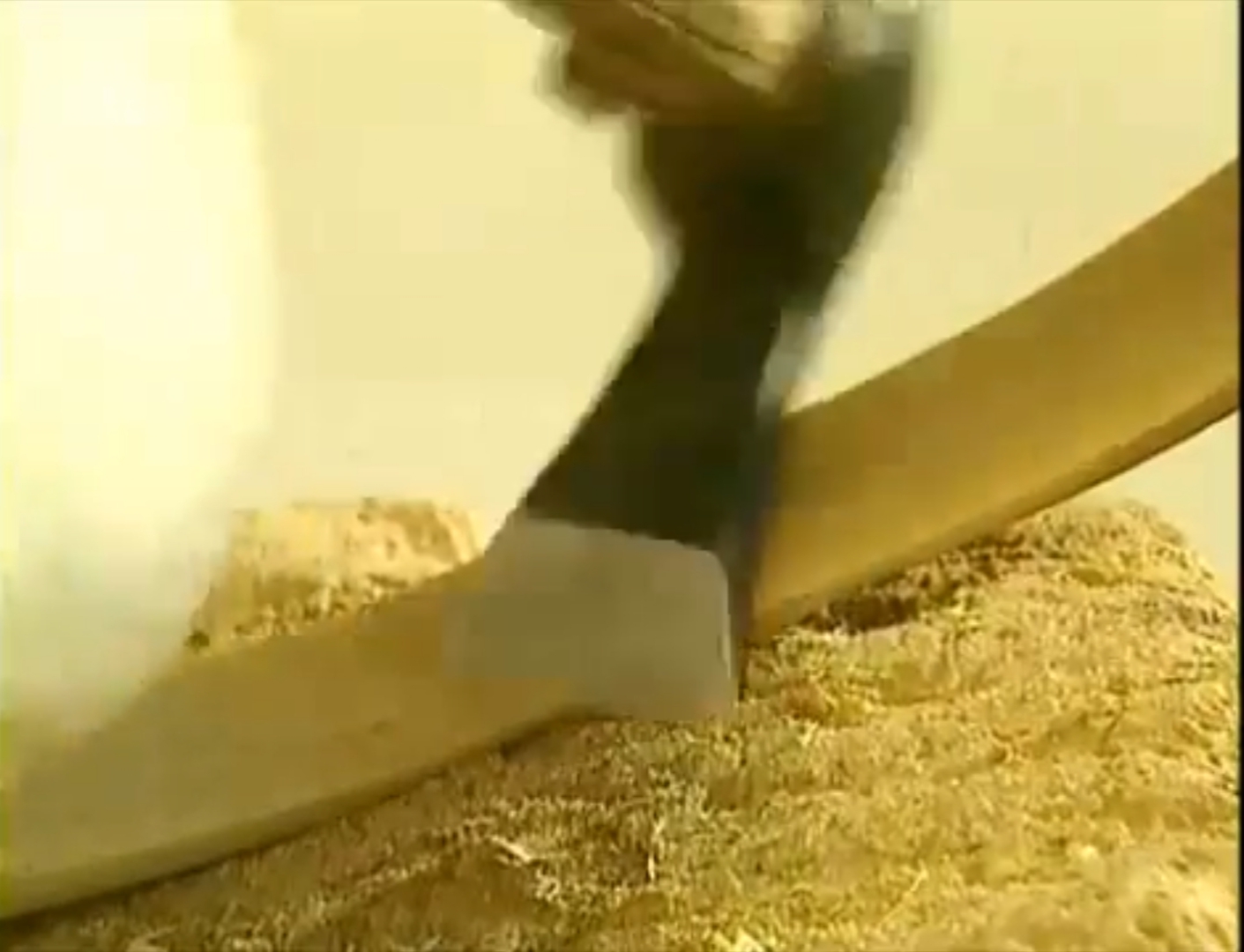 Dann kommt der Moment, bei dem den meisten Bogenbauern, beim schauen des Videos kurz das Herz aussetzen dürfte. Der Bogen wird, mit dem Fuß am Griff und den Händen an den Wurfarmenden abrupt in den Vollauszug gebracht. Ob dies wirklich so gemacht wurde, oder nur durch den Videoschnitt so rüber kommt, weis ich nicht.