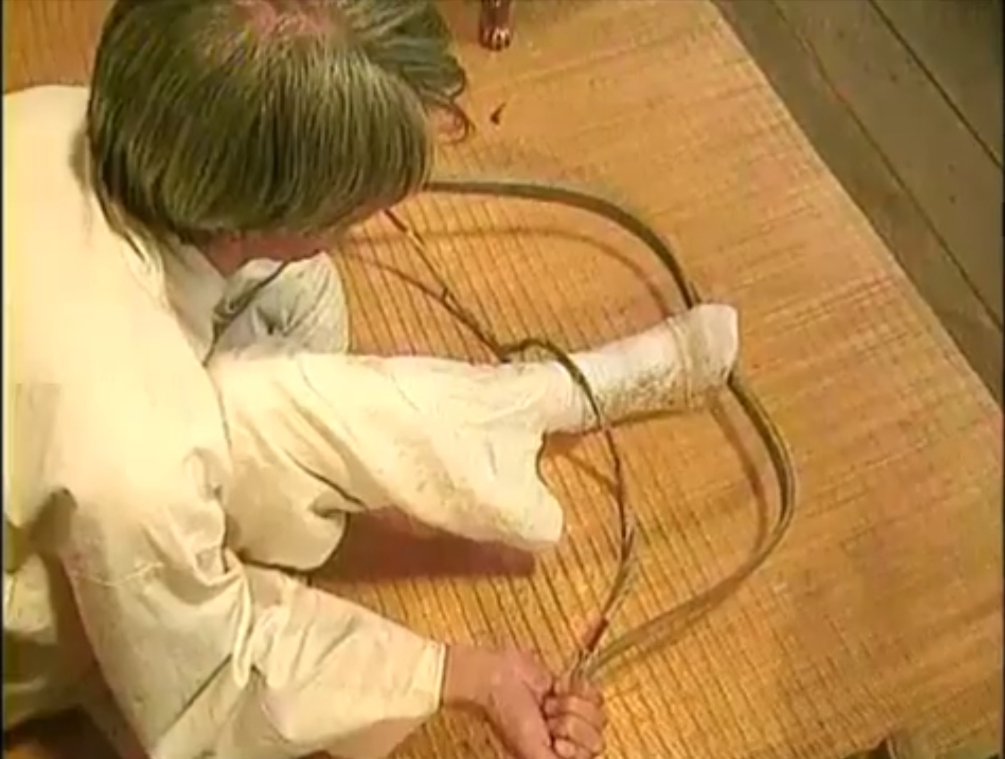 Der Rücken wird nun fertig ausgeformt. Im Video schlecht zu erkennen ist der genaue dickenverlauf und die Formgebung im Bereich des Siyahs. Hier wurde eigentlich der ganze Rücken Ellipsenförmig ausgearbeitet. Nur der Bereich des Siyahs nach dem stark reflexen Knick ist noch in Rohzustand. Danach werden die Enden mit Hilfe eines Holzplättchens zusammengebunden. Anschließend wird der Rücken mit Schwimmblasenleim grundiert. Besonders interessant finde ich es, wie die Sehnen für den Belag vorbereitet werden.