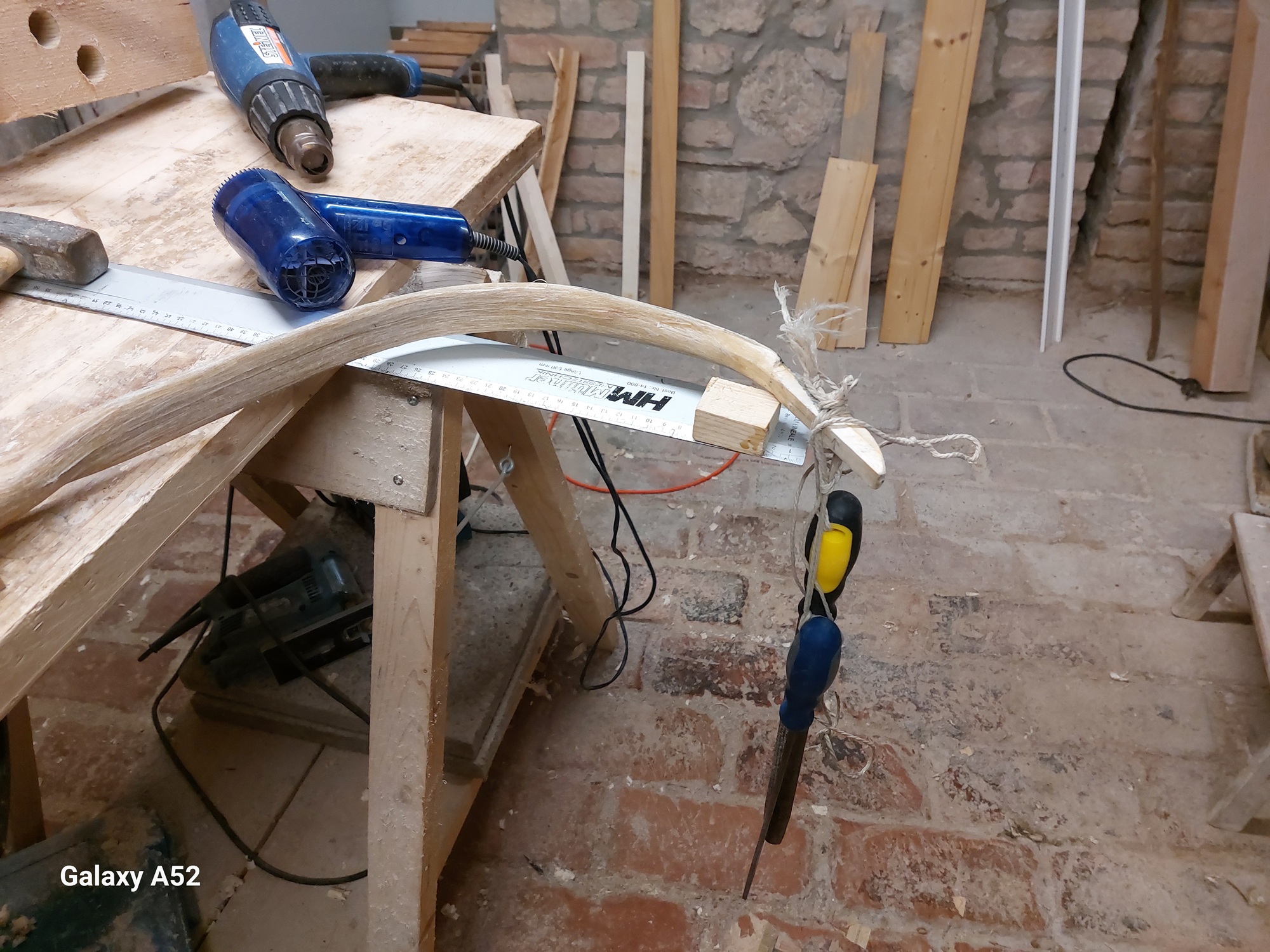 mit Wärme eine Verdrehung korrigieren geht selbstverständlich. Siehe auch A. Karpowicz/Osmanische Kompositbogen - Konstruktion und Design. Da Sehne und Hasenhautleim über 50°C degradieren (je höher die T. desto schlimmer), habe ich den abgespannten verdrehten WA 15min zwischen Wärmflaschen mit 55°C heissem Wasser gepackt und sofort dick mit Decken eingewickelt. Dann muss man schnell arbeiten: Bogen auspacken, sofort mit dem WA auf eine leicht gepolsterte Unterlage spannen und den verdrehten WA kräftig zurückdrehen, etwas überdreht aber dabei nicht aufbiegen (eher minimal zurück), in dieser Position fixieren und erkalten lassen. Mit einer HLP würde ich vorsichtig sein, es sei denn, Du hast den Heissluftstrom tatsächlich mit einem Thermometer gemessen, dann sollte auch das gehen, mit bereits in die Biegevorrichtung eingespanntem WA. Diese Korrekturen immer bei abgespanntem Bogen machen.