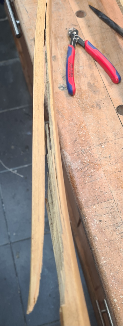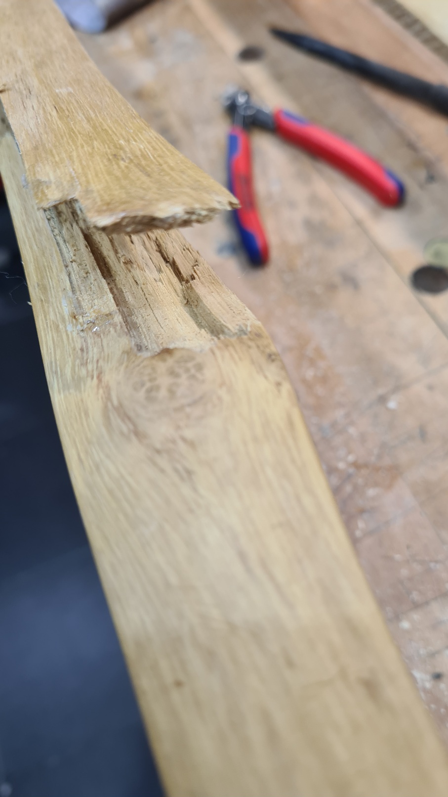 Robinie 45# @ 26" Nach etwa 200 Schuss. Mein Fehler, ich wollte unbedingt über 50m/s kommen und hab ganz leichte Pfeile gebau( Holzpfeil 21) das hat der Bogen nicht verkraftet