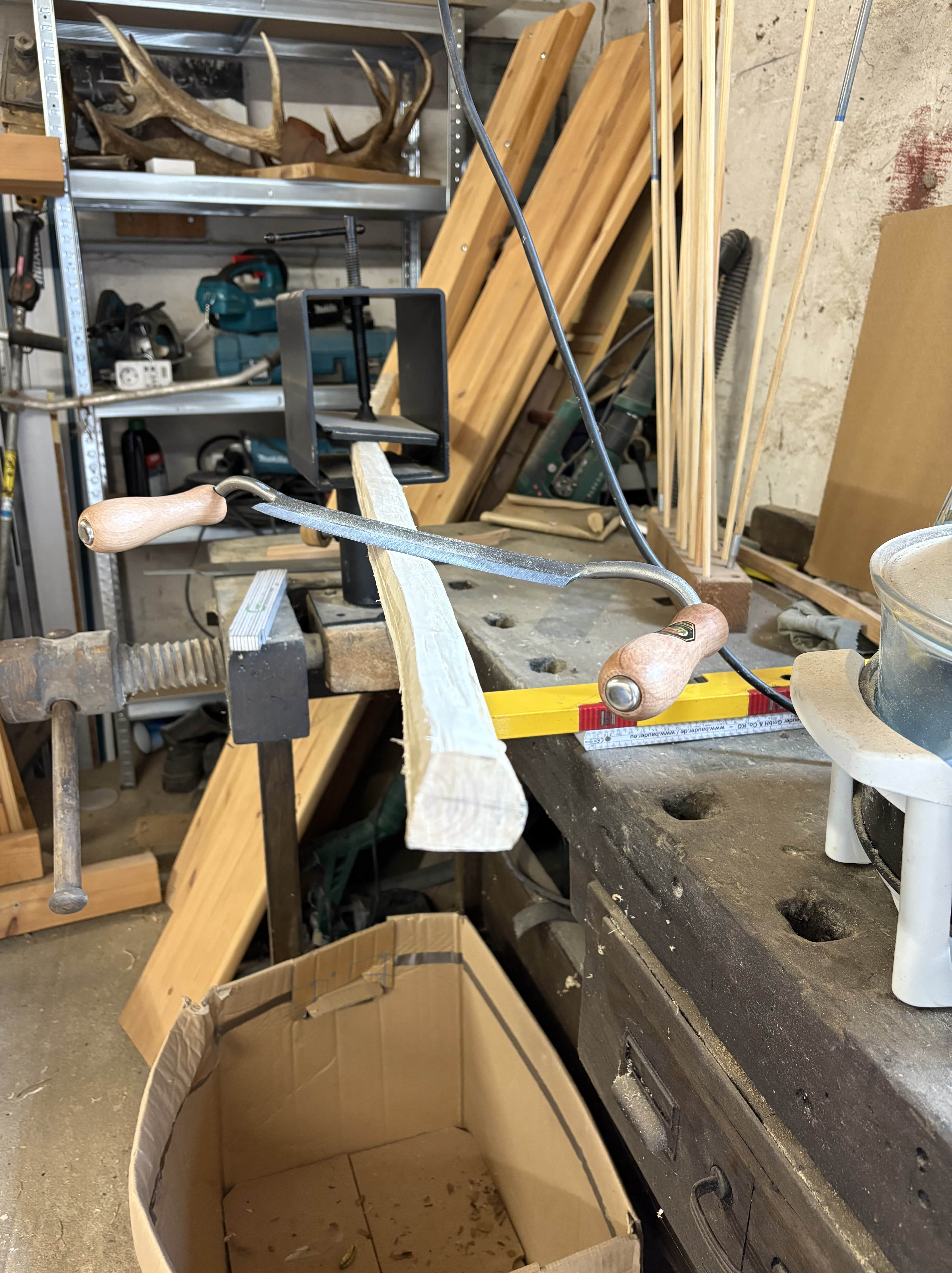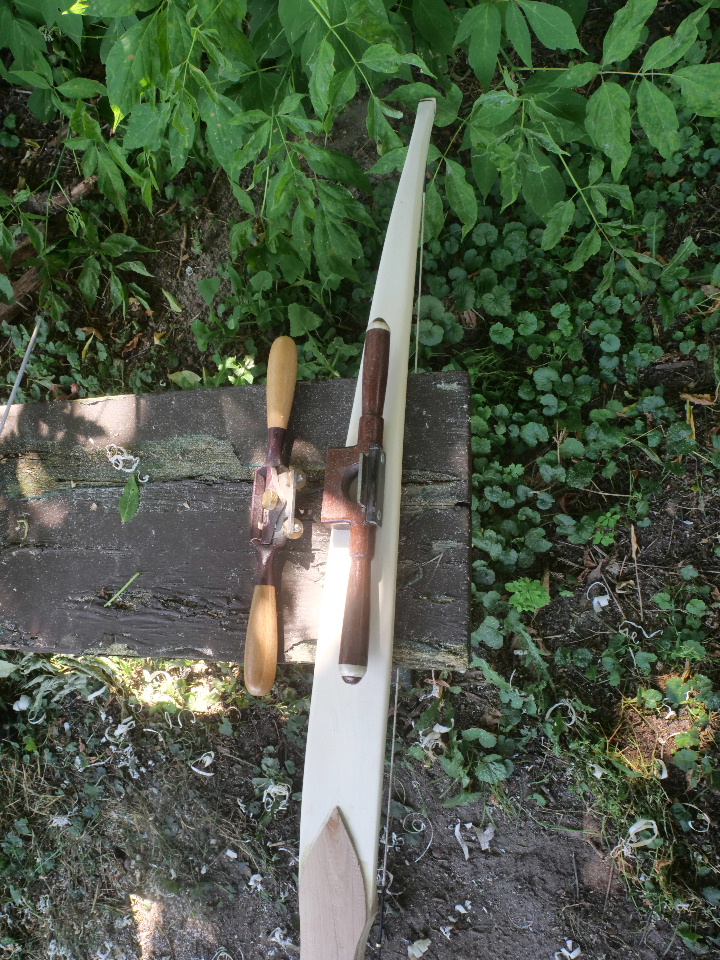 Für mich ein neues Bogenholz: Ilex. Daher erstmal vorsichtig gebaut: breit und lang (55 mm, 178 cm), dazu pyramidale Wurfarme. Ich habe ausschließlich mit Raspel, Schweifhobel und Bowyer´s edge gearbeitet und kam bis zum Aufspannen der Sehne auf Standhöhe. Ich werde berichten, wenn das Teil fertig ist.