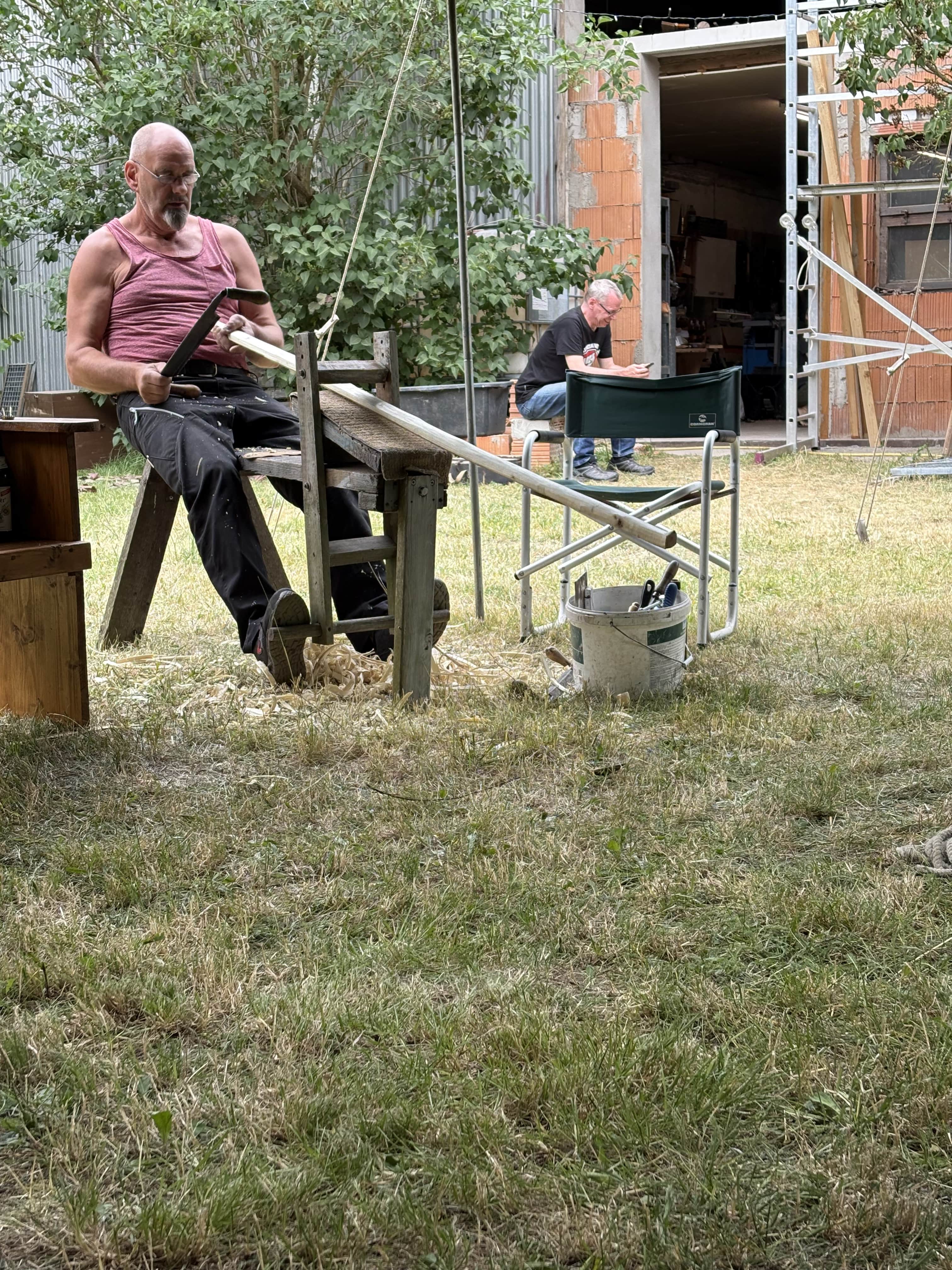 Wer es noch nicht kennt: Kai und Judith veranstalten diesen Bogenbauer-Treff schon eine ganze Reihe von Jahren, einmal jährlich. Er findet auf ihrem großen Resthof statt, diesmal mit dem großen Zeltdach einer Jurte gegen Sonne und Regen. Hier wurde dann an verschiedenen Bögen aus Hartriegel, Esche, Eibe, Ilex, Elsbeere, Glasfaser, Manau und Robinie geschnitzt. Die Damen beschäftigten sich derweil mit dem Spinnen von Wolle mit der Handspindel oder einem neu aktiviertem Spinnrad.