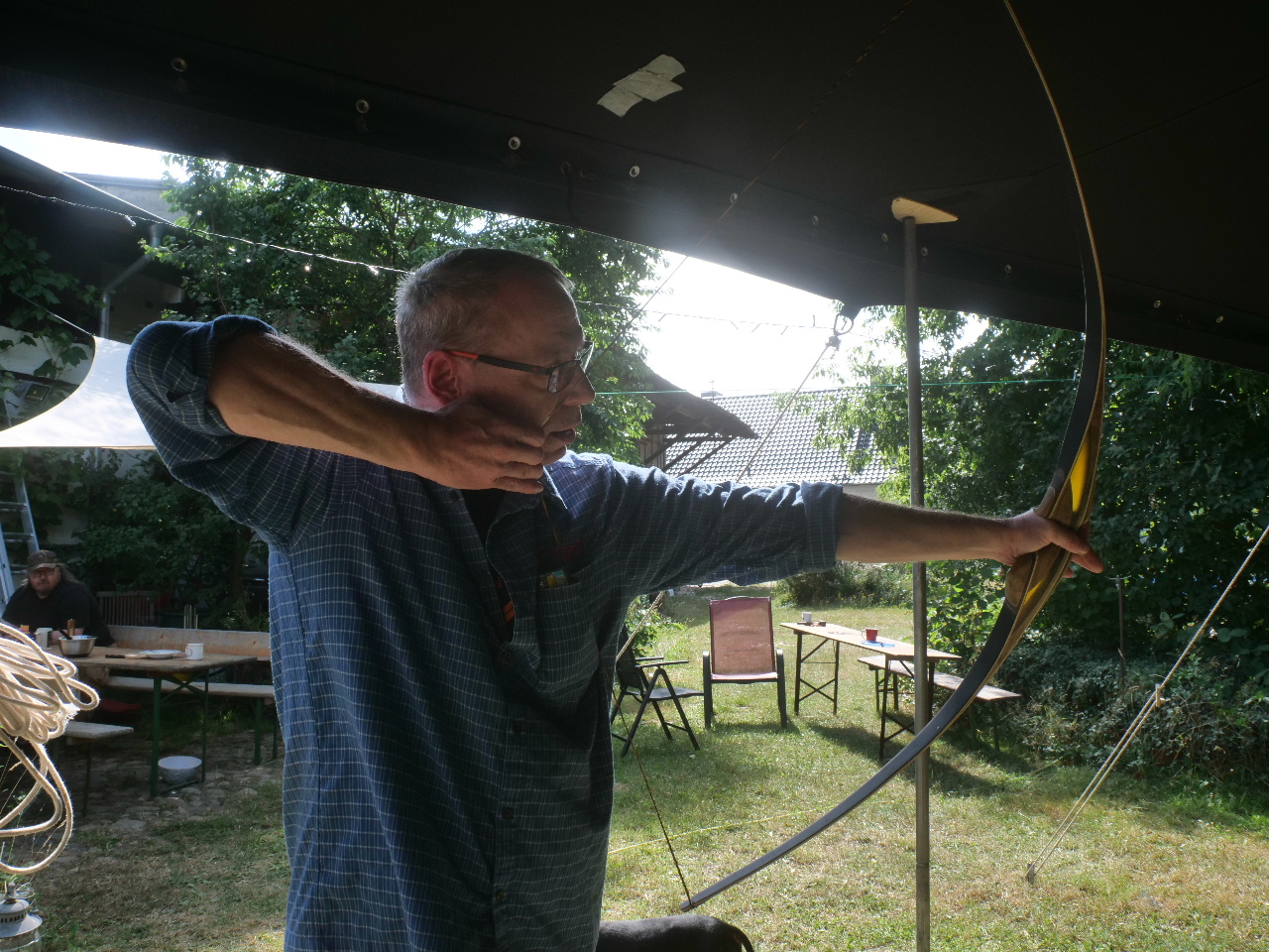 Am Nachmittag kam der Wunsch auf, die fertigen Glasfaserbögen von Jürgen und Theron auszuprobieren. Gesagt – getan. In der großen Scheune mit Schießstand wollte dann fast jeder mal.