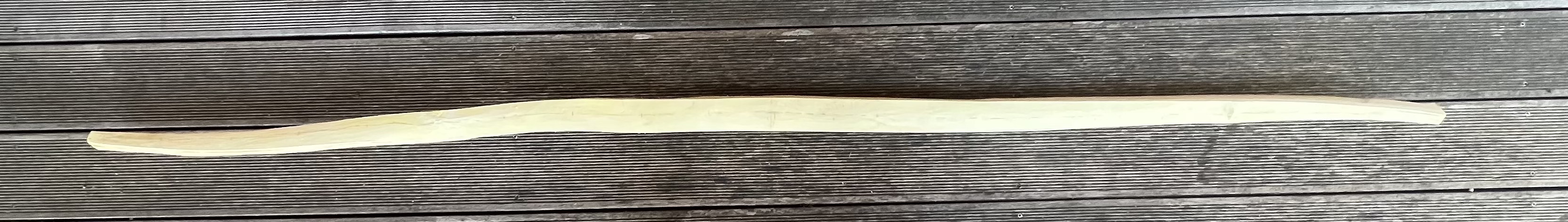 Ich werde den Bogen zunächst symmetrisch bauen und belasse ihn bei 2m, den Griffbereich und die Bogenenden lasse ich anfänglich breit, ich weiß ja noch nicht wie sich der Propeller genau verhalten wird, die Wurfarmenden bleiben steif (15cm), der Griff und die Fadeouts werden eine Länge von 7cm plus 11cm plus 7cm haben. Semipyramidales Design: die Wurfarme sollen im mittleren Drittel am meisten biegen (Mantratiller), am Bauch soll -wie Benedikt auch schon gesagt hat- ein durchgehender Jahresring sein, den Bauch mache ich komplett flach, Tillern werde ich daher vor allem über die Breite und durch das Trapping. Dann schaue ich, wie auf Standhöhe bei neutralem Tiller die Sehne läuft und korrigiere die Sehnenlage über die Wurfarmenden und den Griff. Dann teste ich im Auszug welcher Wurfarm oben sich am angenehmsten verhält und kürze dann den unteren um 3-4 cm, damit sollte sich automatisch ein positiver Tiller einstellen.
