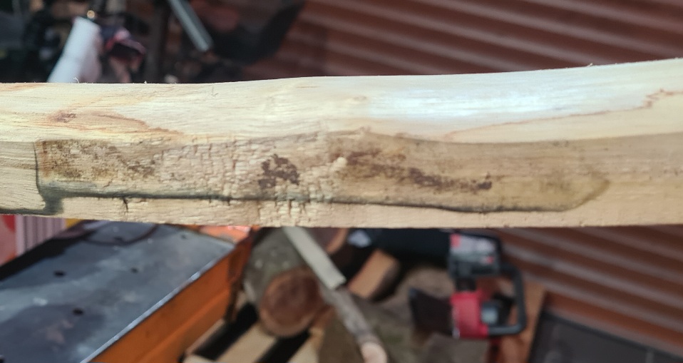 Ich müsste das live sehen, um mir sicher zu sein, aber es sieht so aus, als köööönnte es sein, dass du teils in die Fasern des Spätholzes reingeschnippelt hast. Das würde auch die Rückenbrüche erklären. Von irgendwo 50+ Robinienbögen is mir noch nie einer über den Rücken gestorben. Hier mal bei ein paar Stellen eingezeichnet, was ich meine: