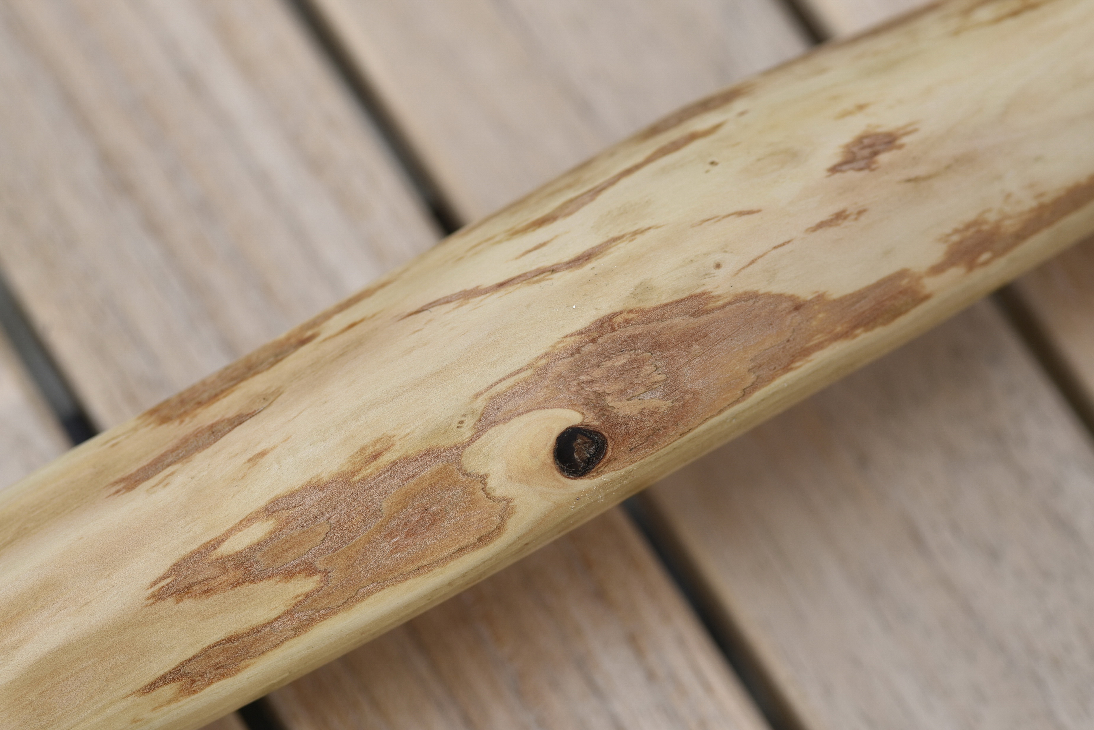 Da er schon fast 20 Jahre im Schuppen lag, wurde er auch von Insekten besucht, beim Entrinden wurde der Rücken auch verletzt,