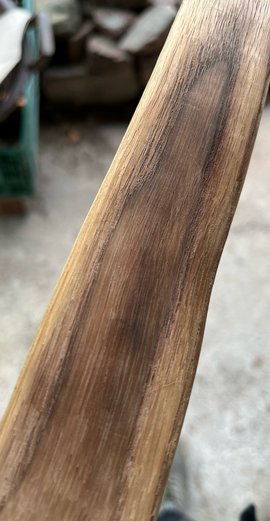 Ich hatte hier noch einen halbfertigen Robinienbogen mit einem Splintring am Rücken rumstehen seit nunmehr so 9-10 Jahren. Der wurde eigtl. ausgemustert, da das die Qualität an Robinie ist, die mir gern knittert (etwas jüngerer Stamm, 6-8mm Jahresringe), und ich damals dumm war und den auf Standhöhe packen wollte, als er noch weit jenseits der 100# war, was mir zurecht mit etwas Knitter an den Fades beantwortet wurde. Beim Aufspannversuch hats mir auch ein Overlay weggehauen, und das war dann alles in allem genug Frust, um das Ding in die Ecke zu stellen. Bis vorgestern