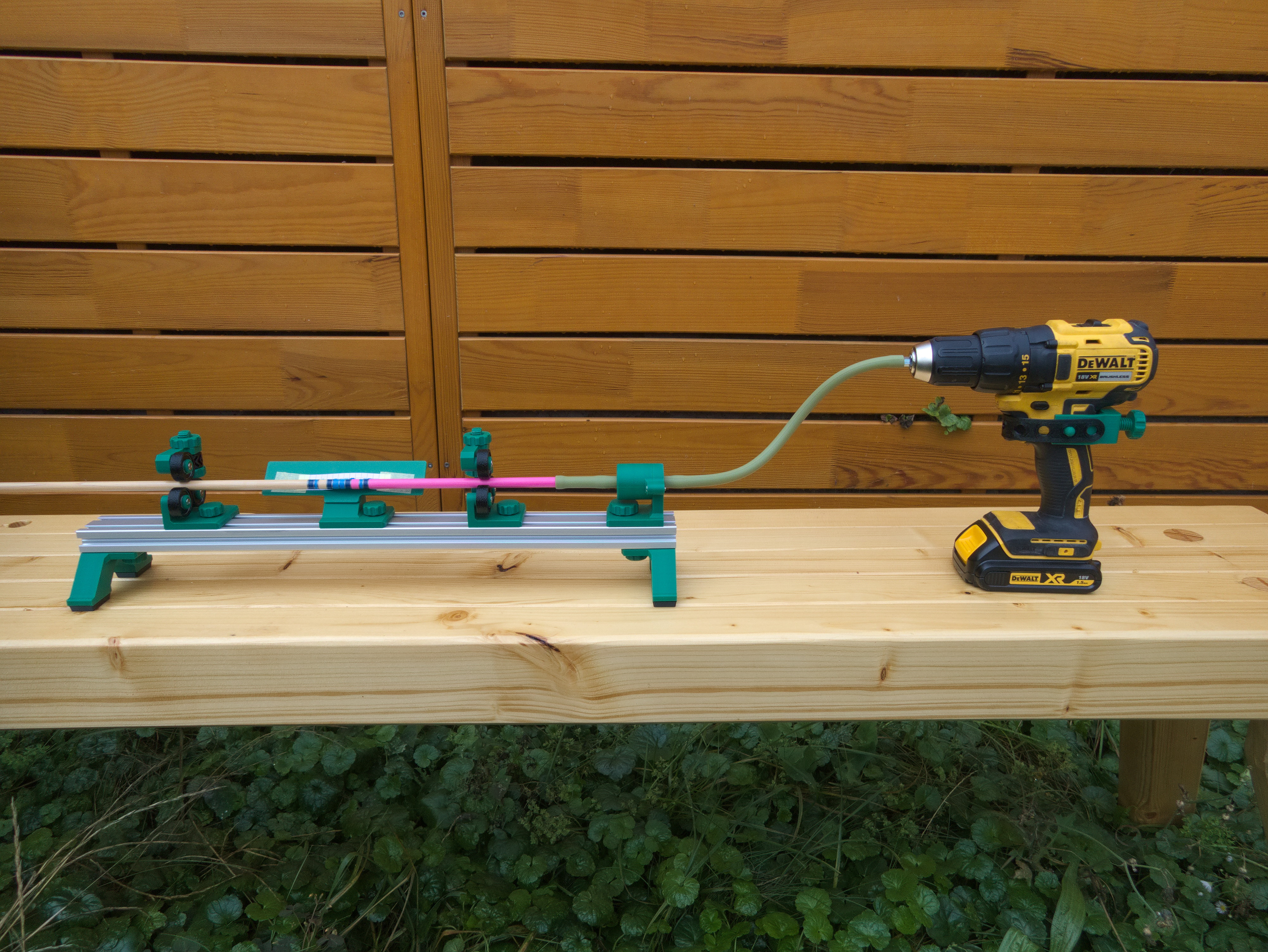 - Flexible Kraftübertragung mit fester Antriebswelle: Die Bohrmaschine ist über einen dicken Silikonschlauch mit der Welle verbunden, die in zwei Lagern läuft und den Pfeil dreht. So wird das Wackeln des Schlauchs nicht auf den Pfeil übertragen.
