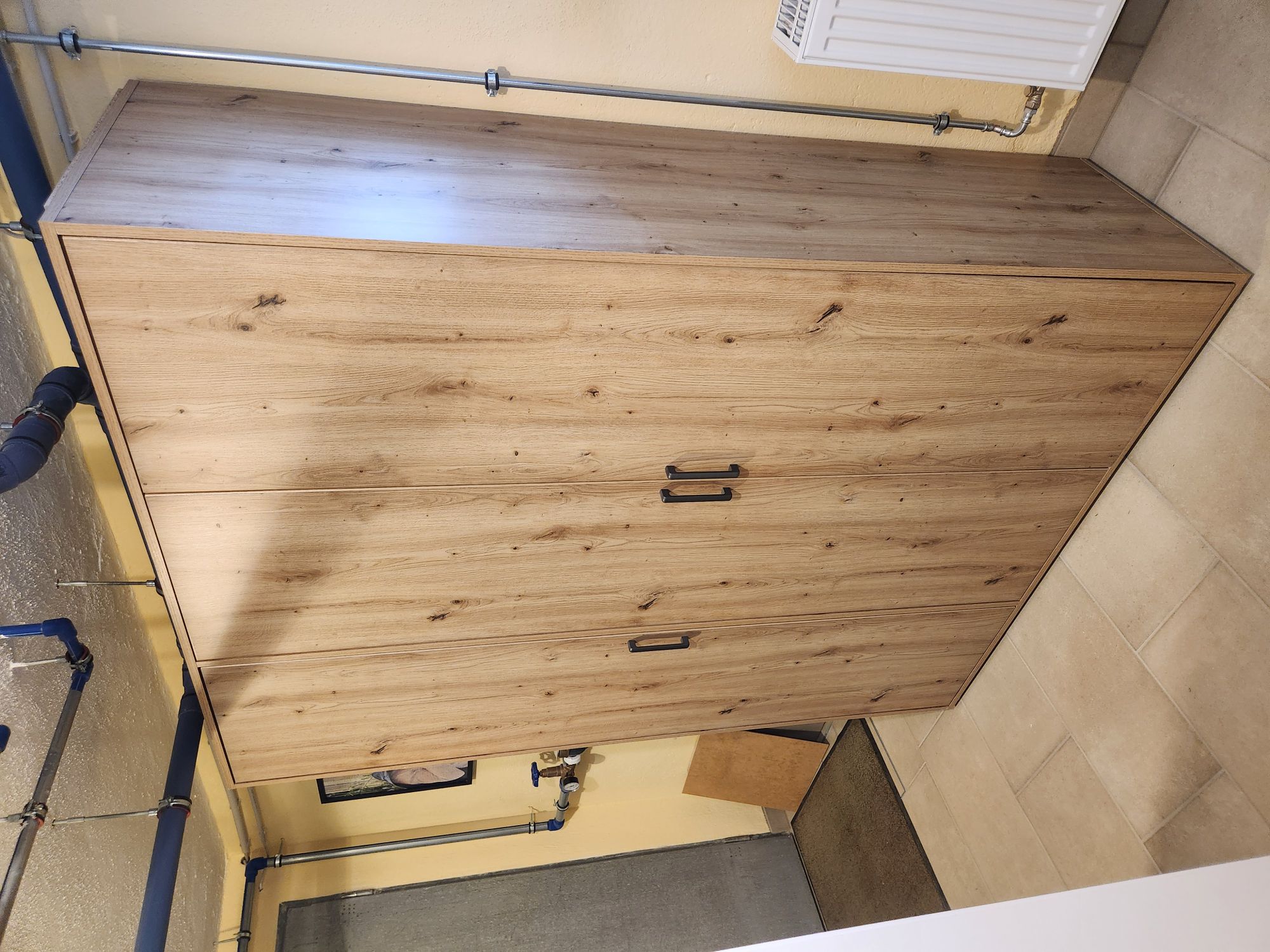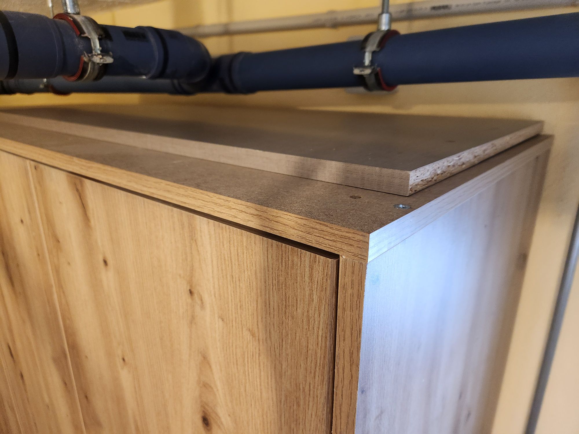 Ursprünglich wollte ich die Holzklötze von oben schrauben, der Schrank ist aber von oben nicht vernünftig zugänglich. Deshalb hab ich ein weiteres Brett oben auf den Schrank gelegt weil ich dem einzelnen Spanbrett nicht vertraut hab und hab das ganze dann von unten geschraubt.