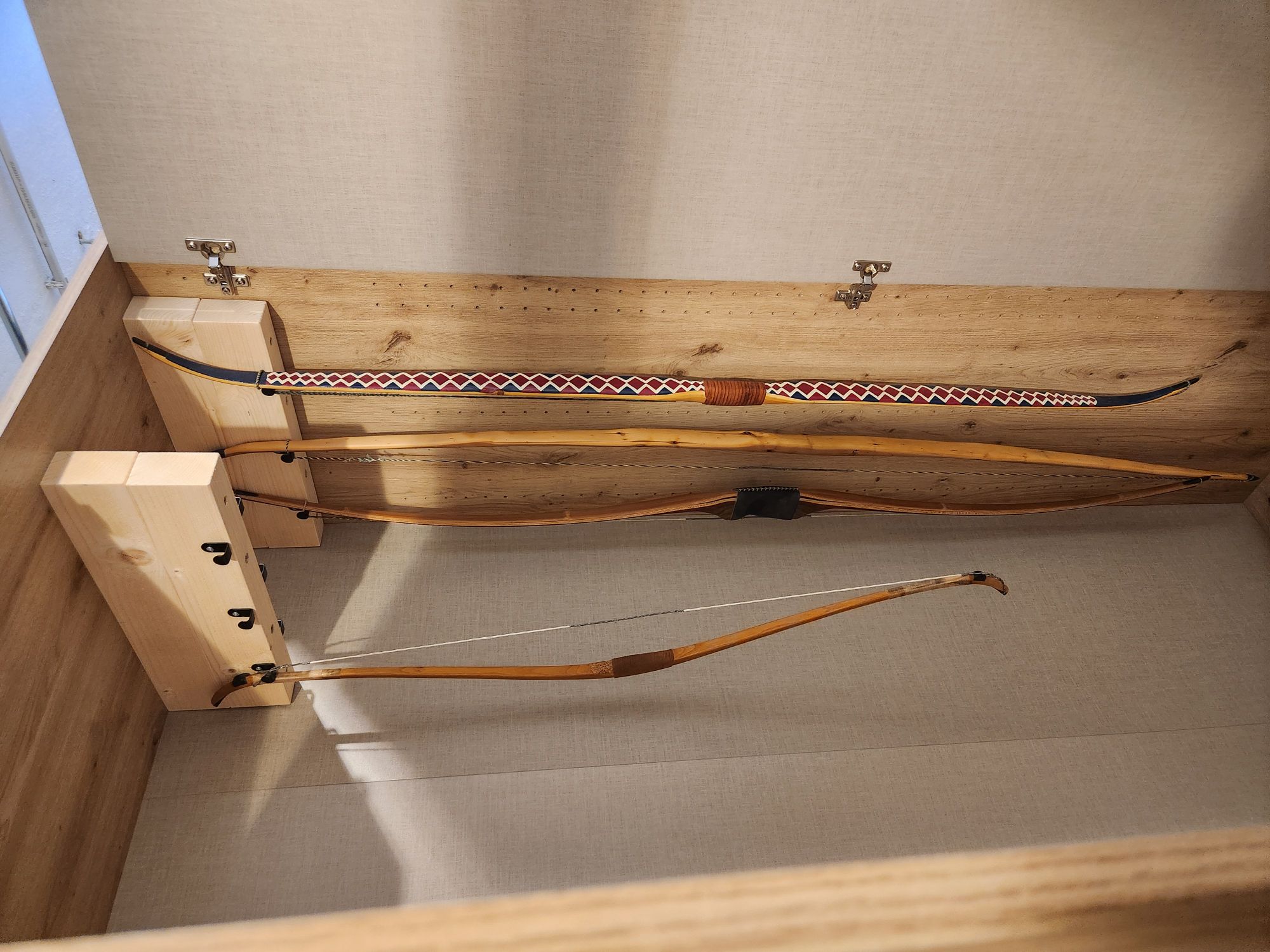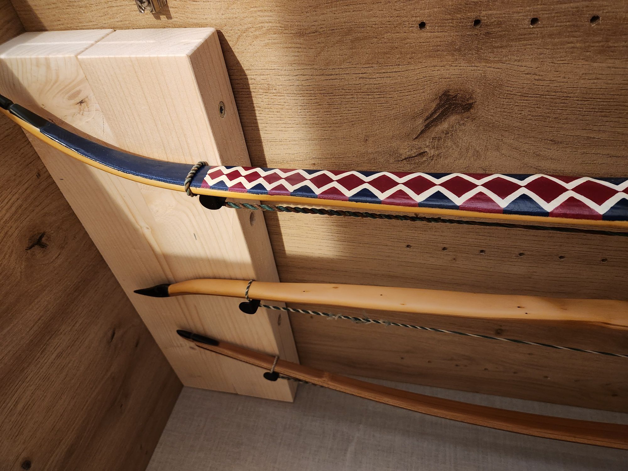 Ich hab grad ein neues Projekt in Angriff genommen weil mir der Platz für meine Bögen langsam knapp wurde und wir im Herbst auch noch renoviert haben wobei mir mein ursprünglicher Bogenplatz verloren ging. Außerdem sind sie auf ihrem alten Platz (in meiner Werkstatt) dauernd eingestaubt.
