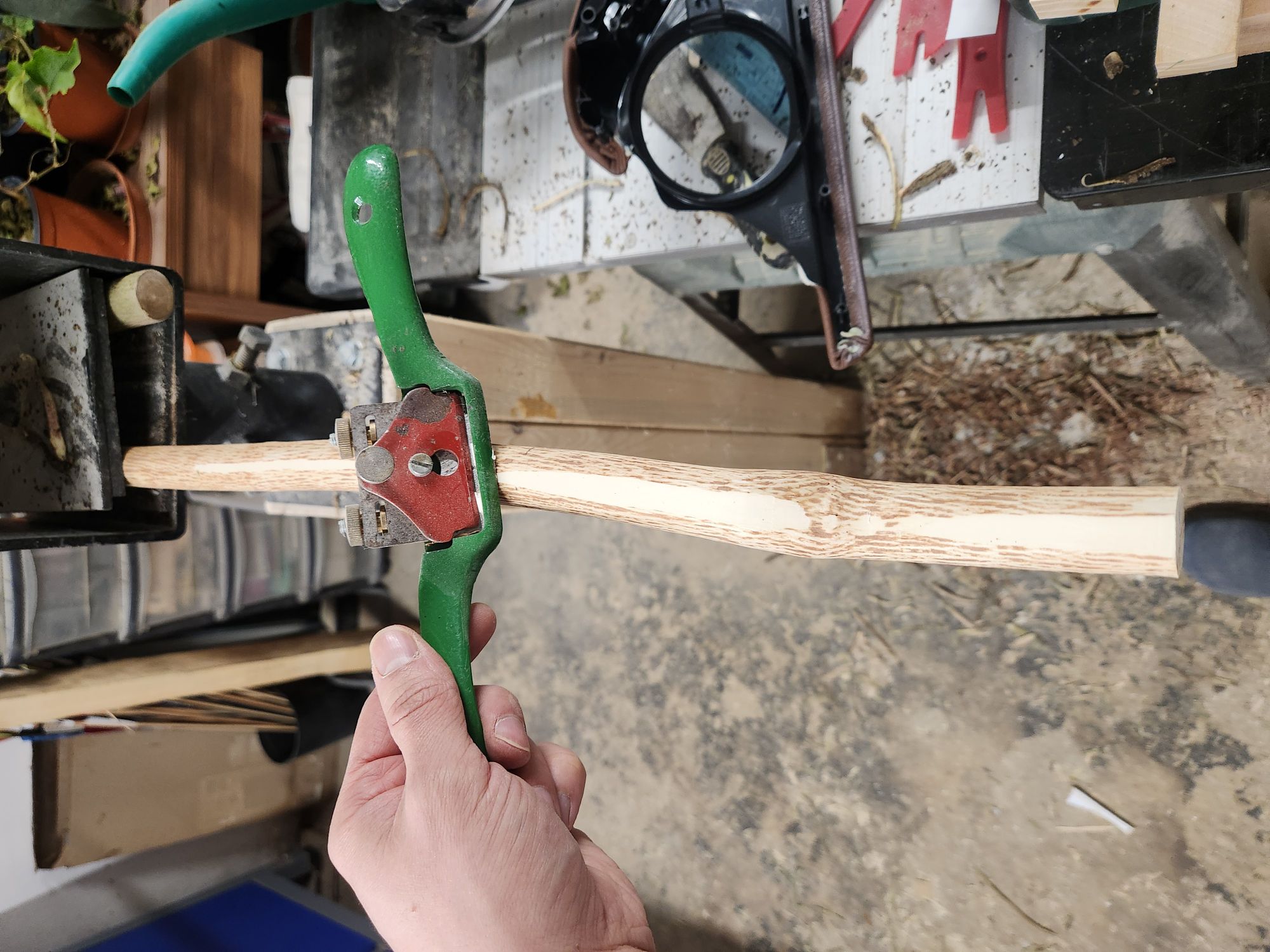 Zuerst hab ich das gerade Stück rausgeschnitten und mit der Bandsäge mittig geteilt. Dicke liegt jetzt wo bei 17mm. Entrindet sind se natürlich auch schon. Und für den Griffaufbau, und um auch den inneren Bereich der Wurfarme dicker zu machen hab ich aus dem Reststück auch noch den geraden Bereich rausgeschnitten und mittig geteilt. Diese Teile sind 60cm lang. Diese werd ich dann vll auch zusammen Spleißen um mehr vom Bogen abzudecken.