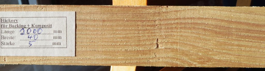 Hallo, heute habe ich zwei Hickoryleisten bekommen, 5mm Dicke für einen Rattanbogen als backing (Bauchseite wäre die natürliche Aussenschicht) und 7mm für einen O.O.-Bogen mit Hickory-backing und meinen beiden O.O.-Leisten. Das was geliefert wurde, habe ich so nicht erwartet, Hickory gibt besseres her, ich überlege ob ich die Leisten zurückschicke.