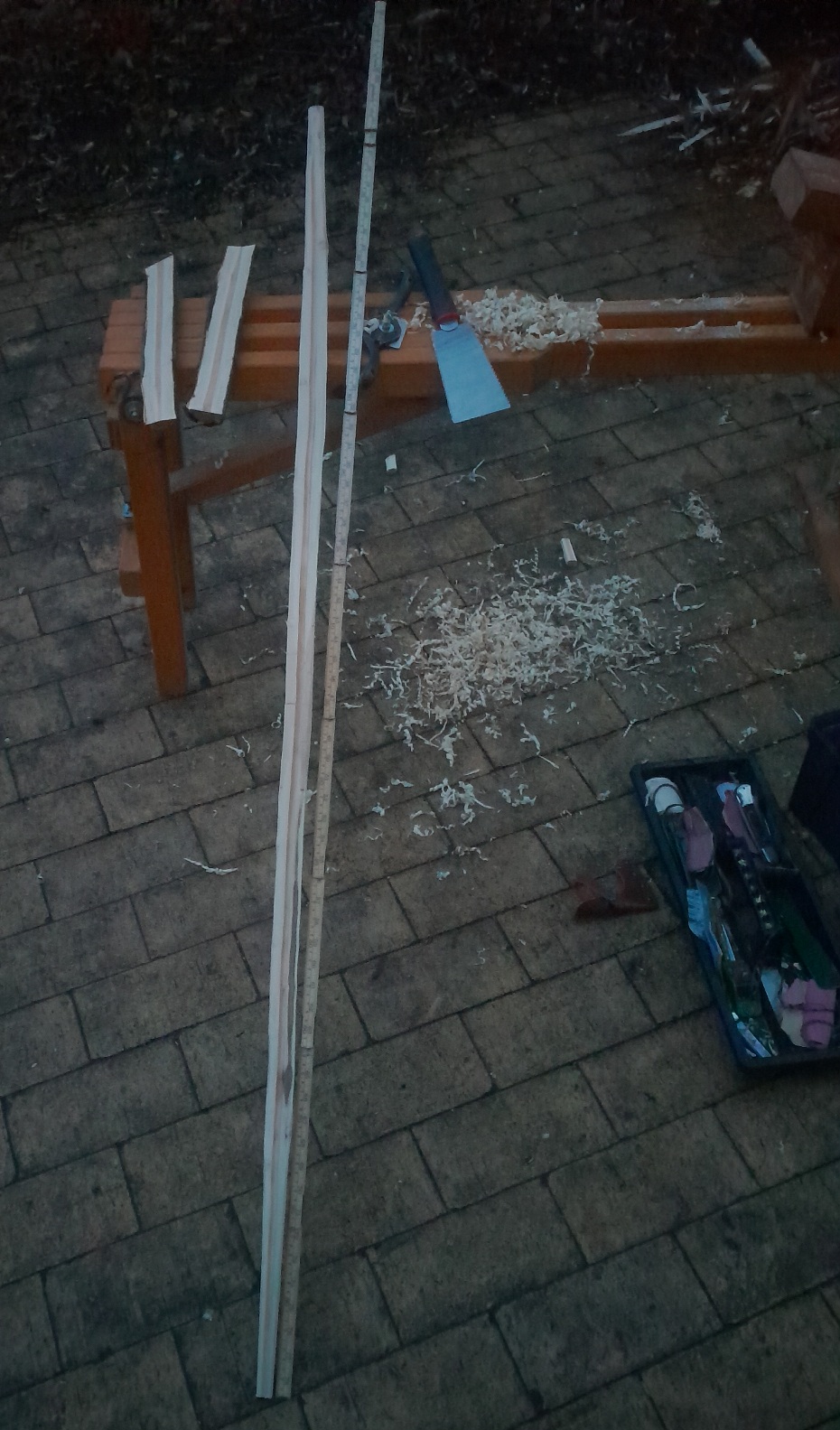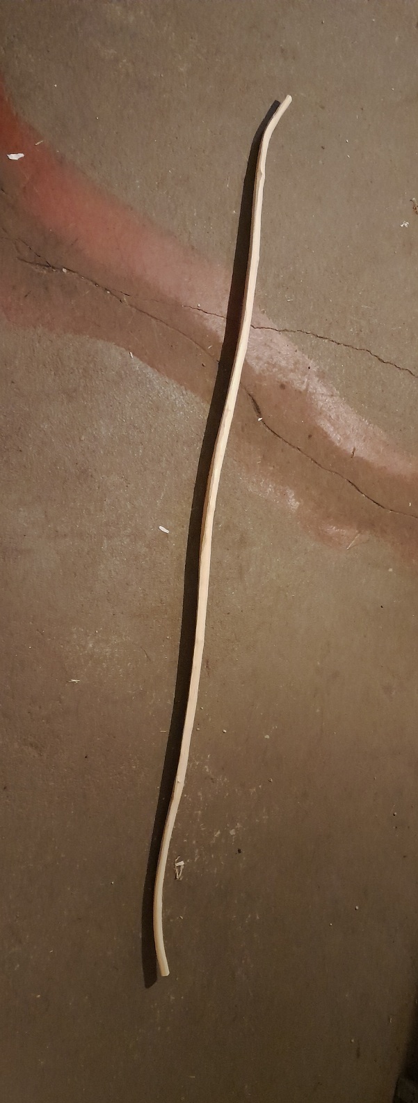 Das ganze fühlt sich bis jetzt eher wabbelig an, weshalb ich auf 62" gekürzt habe und nun doch noch den noch vorhandenen Abschnitt vom Stämmchen gespalten und entrindet habe, um vielleicht einen kurzen steifen Griff aufzubauen.